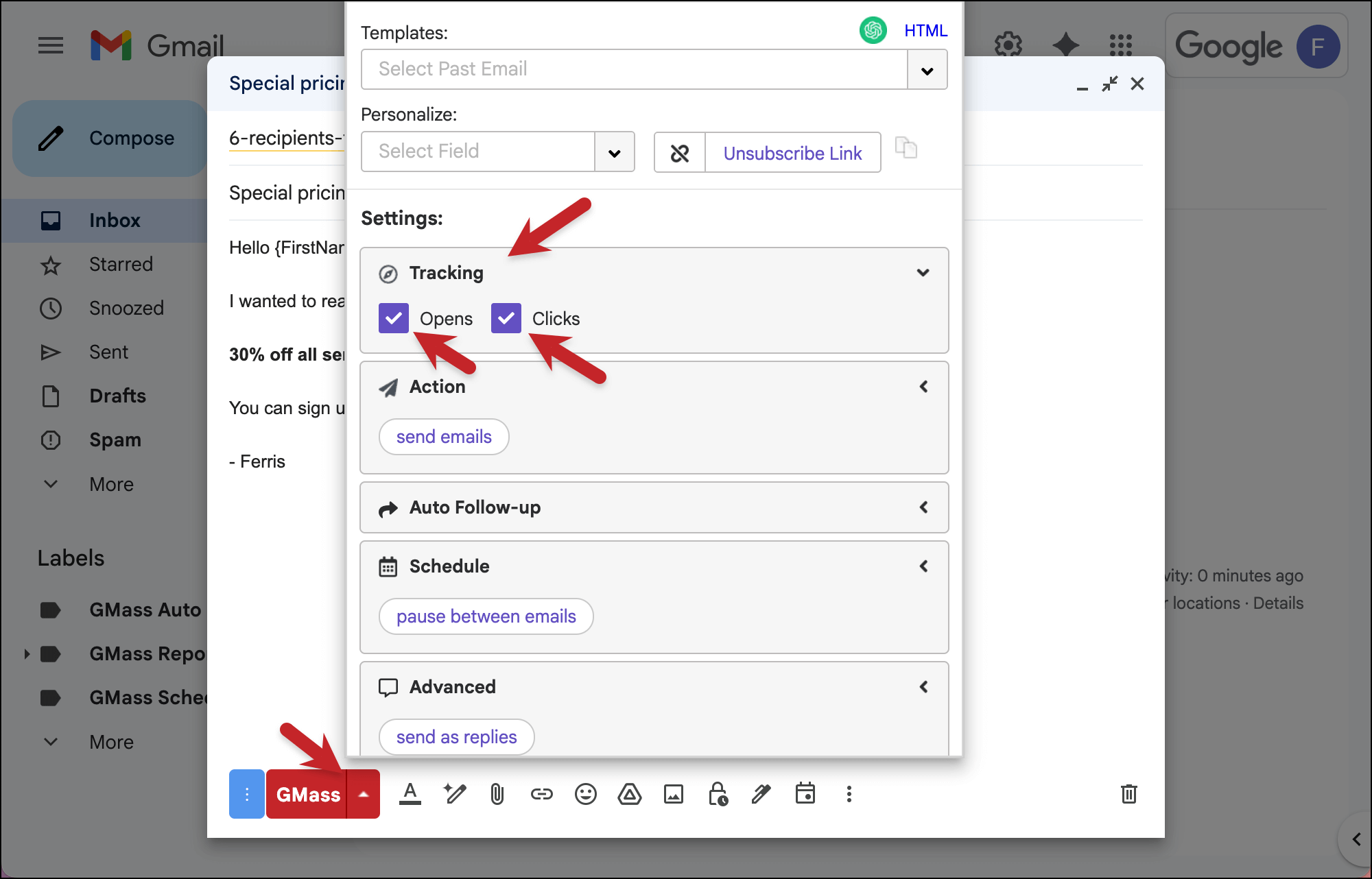 1. Open the GMass settings for your campaign, open the Tracking section, and turn on Open and Click tracking