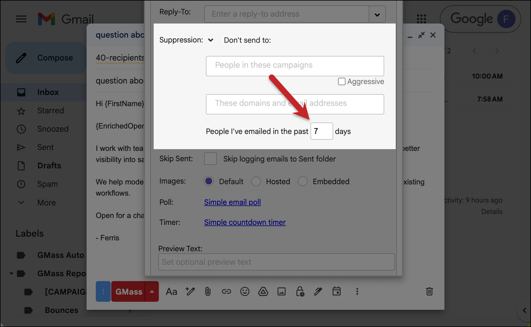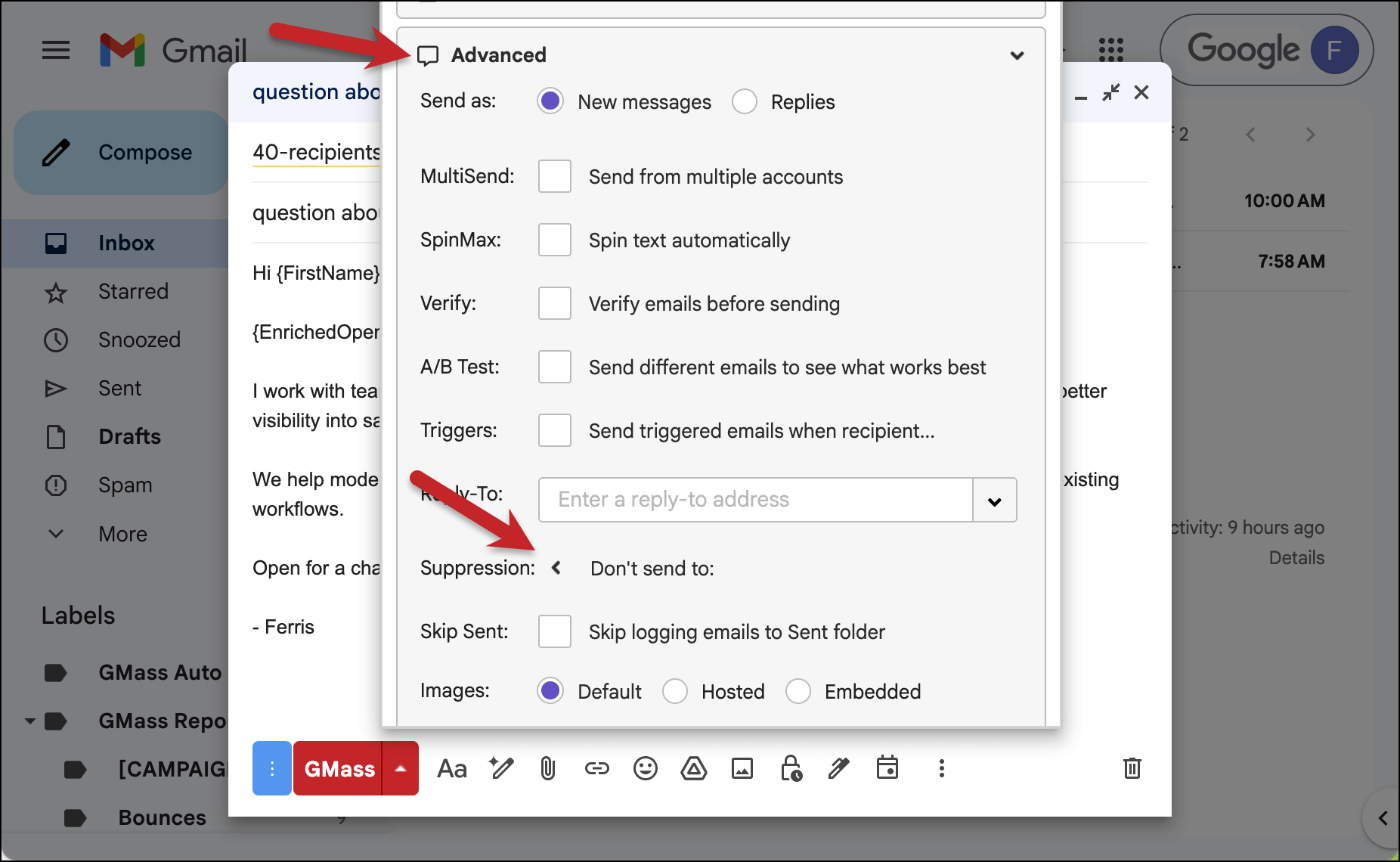 We’re going to use GMass’s suppression feature to exclude those recipients. Suppression is like briefly and temporarily “unsubscribing” someone from one particular campaign.