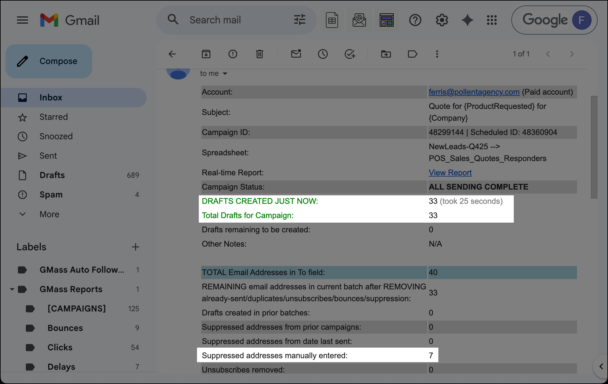(For my test, if you were eagle eyed through all of they above, you’ll see I had 7 people in my exclusion Google Sheet and 40 people in my campaign. So when I generated drafts of my campaign, GMass correctly created 33 emails and suppressed 7.)