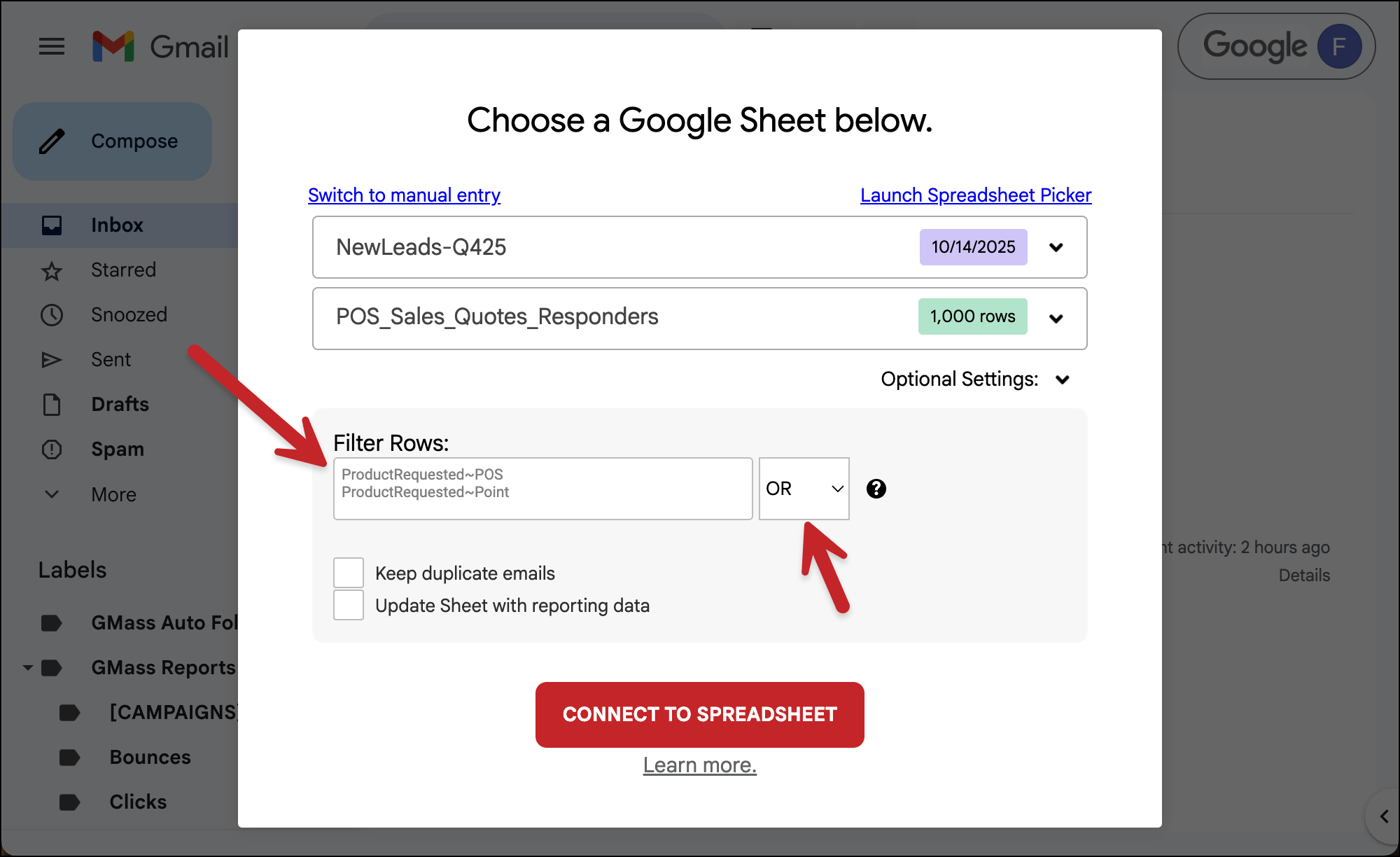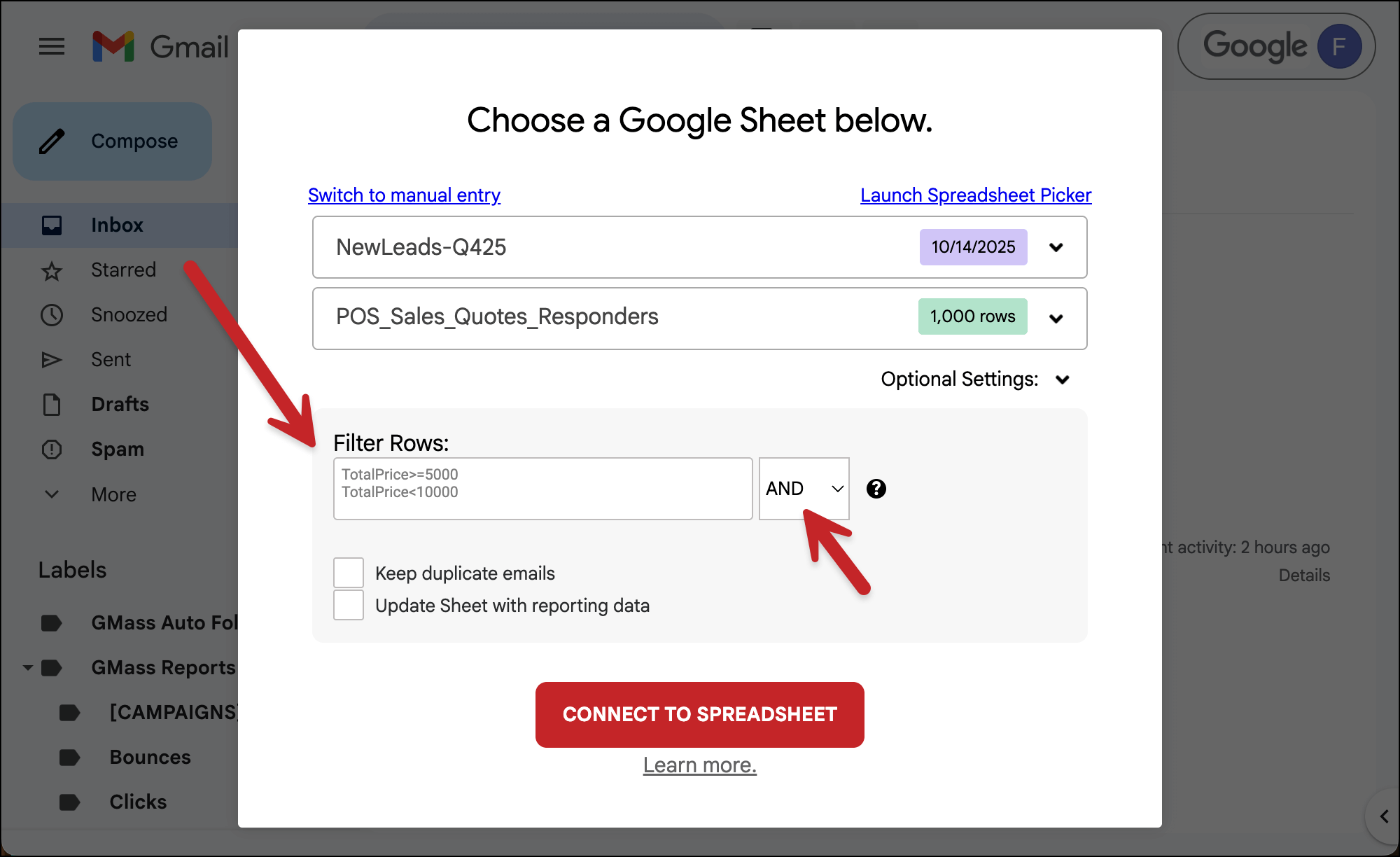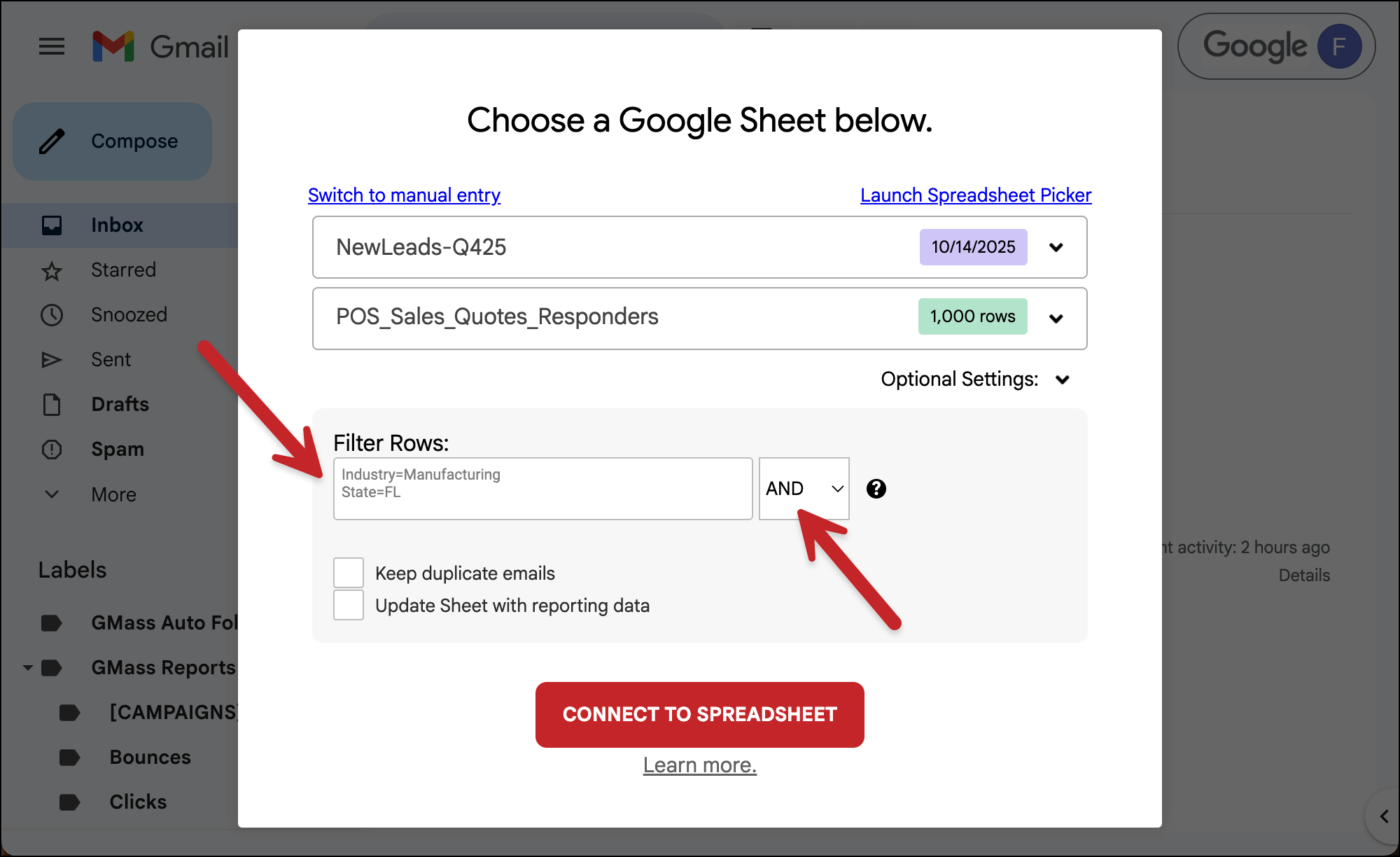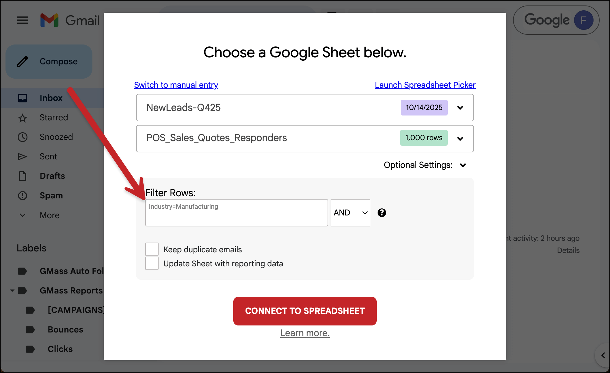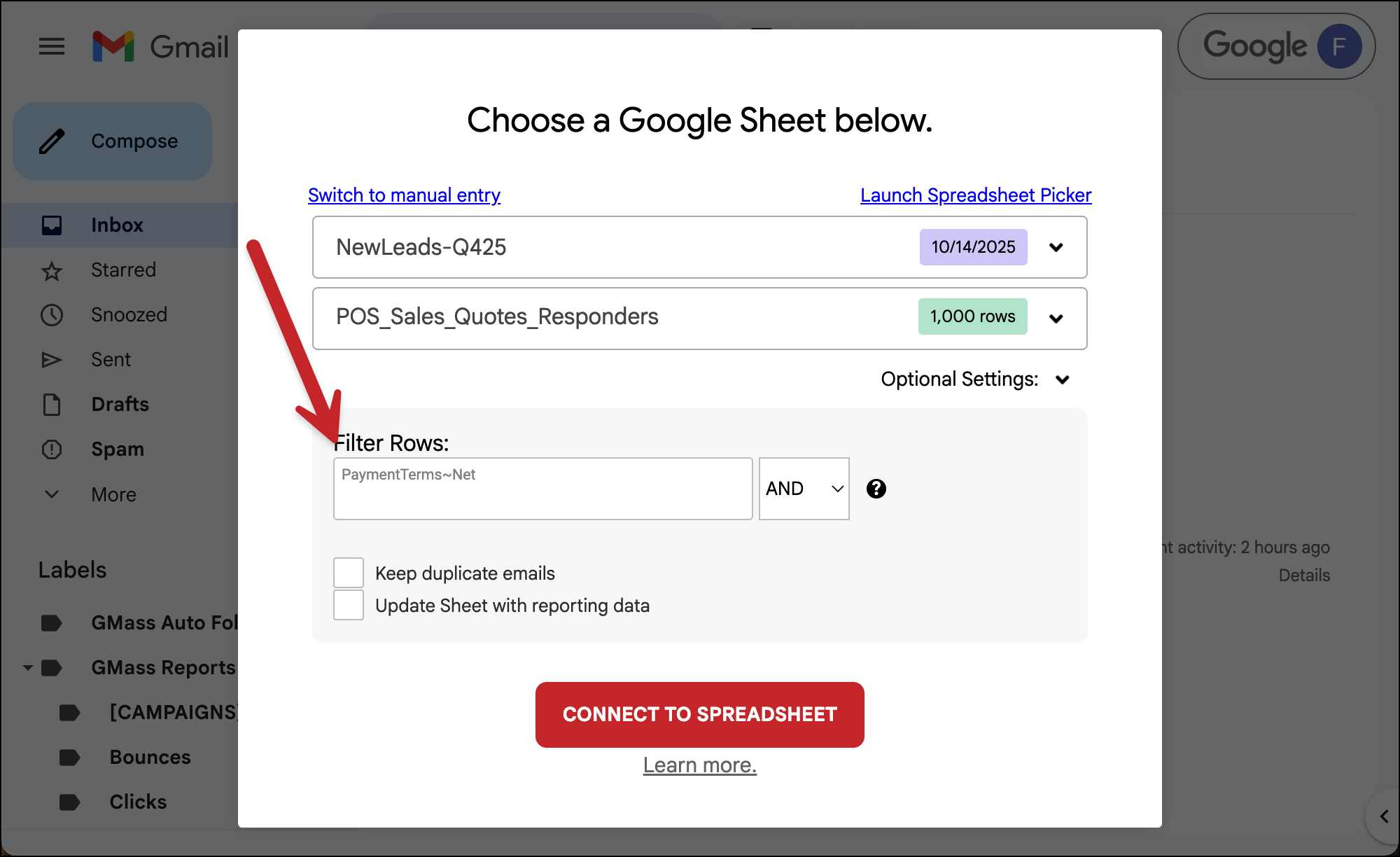 That’s where GMass filters come in. You can use filters to send only to specific rows of a Google Sheet who match specific criteria.