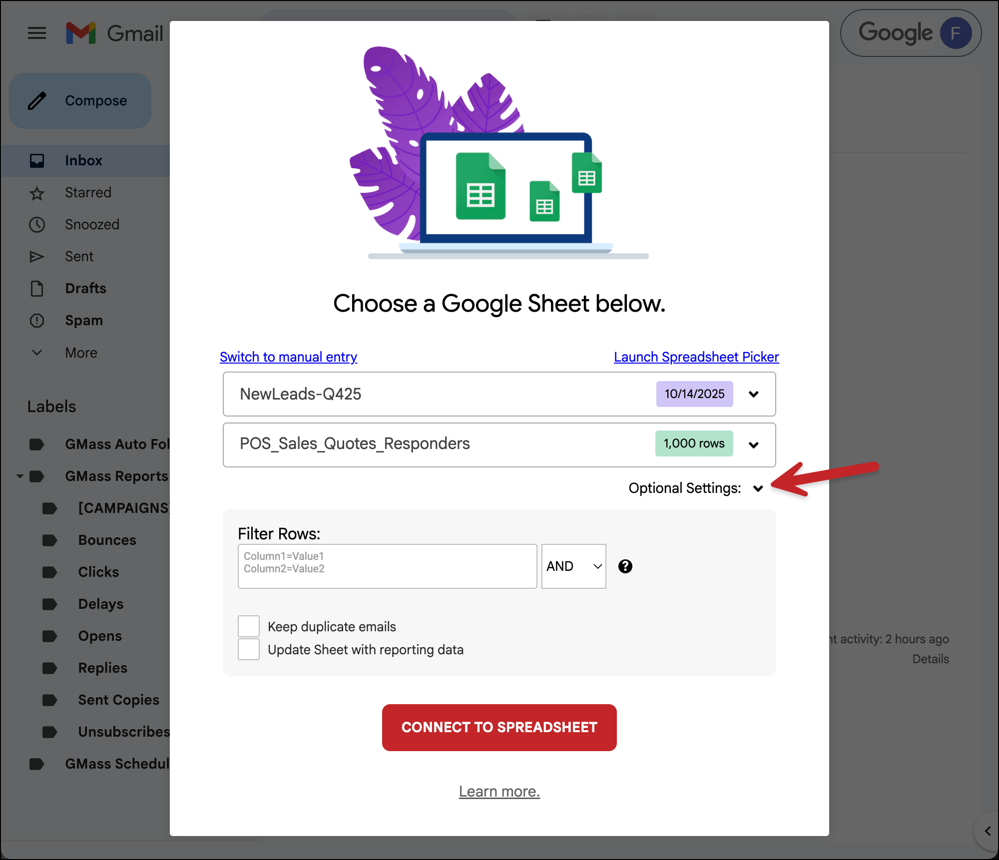 You’ll start by connecting your Google Sheet, then opening the Optional Settings in the connection box.