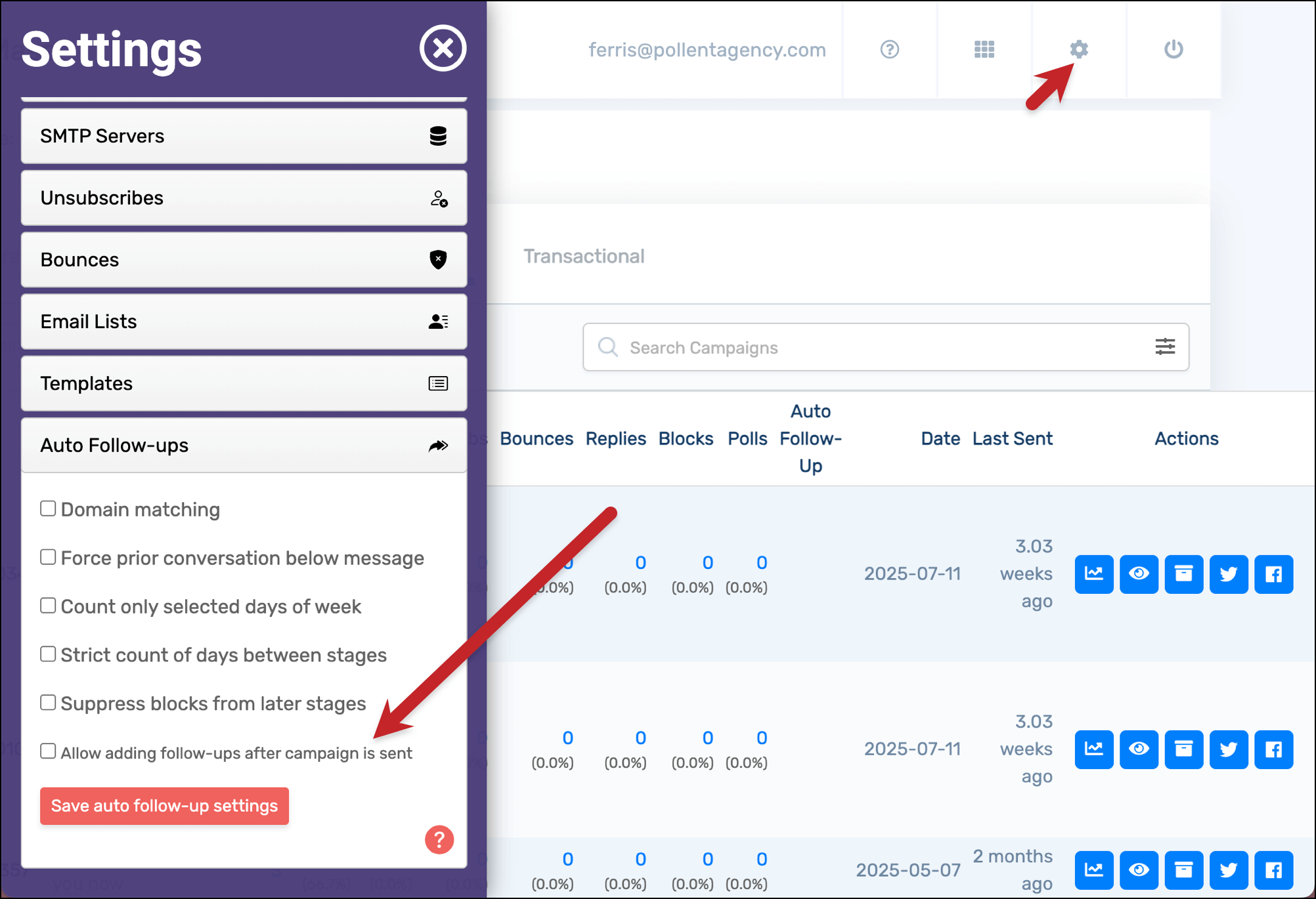 First step: Determine if you’ve enabled “Allow adding follow-ups after a campaign is sent”