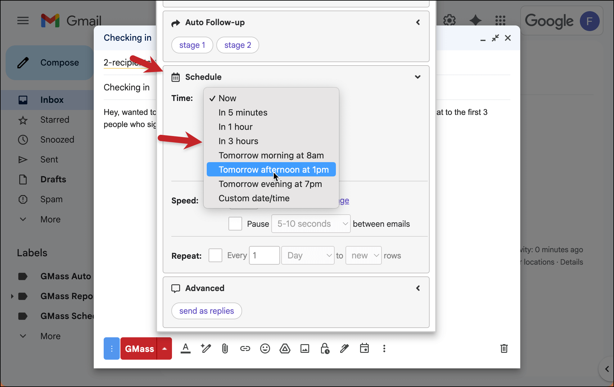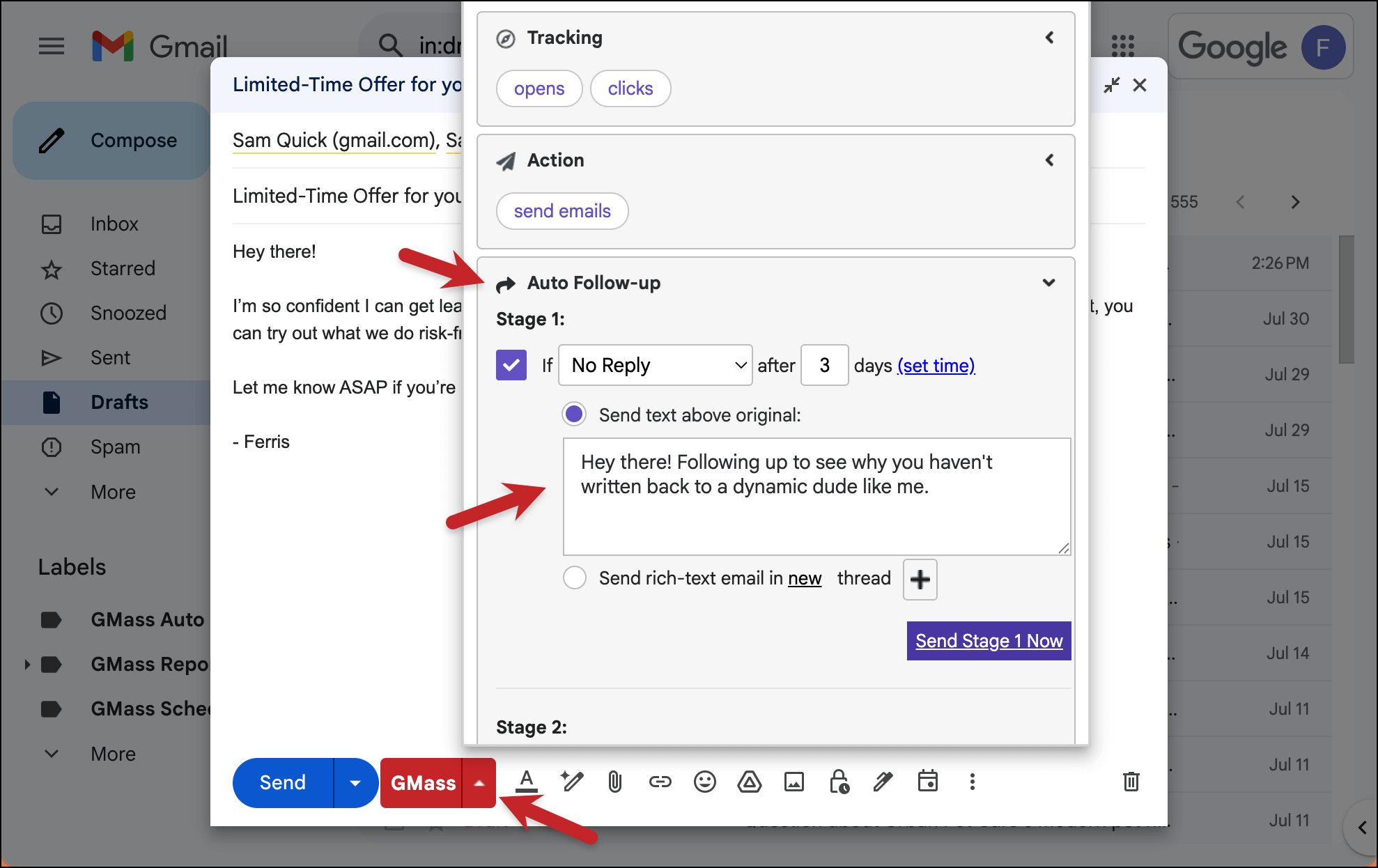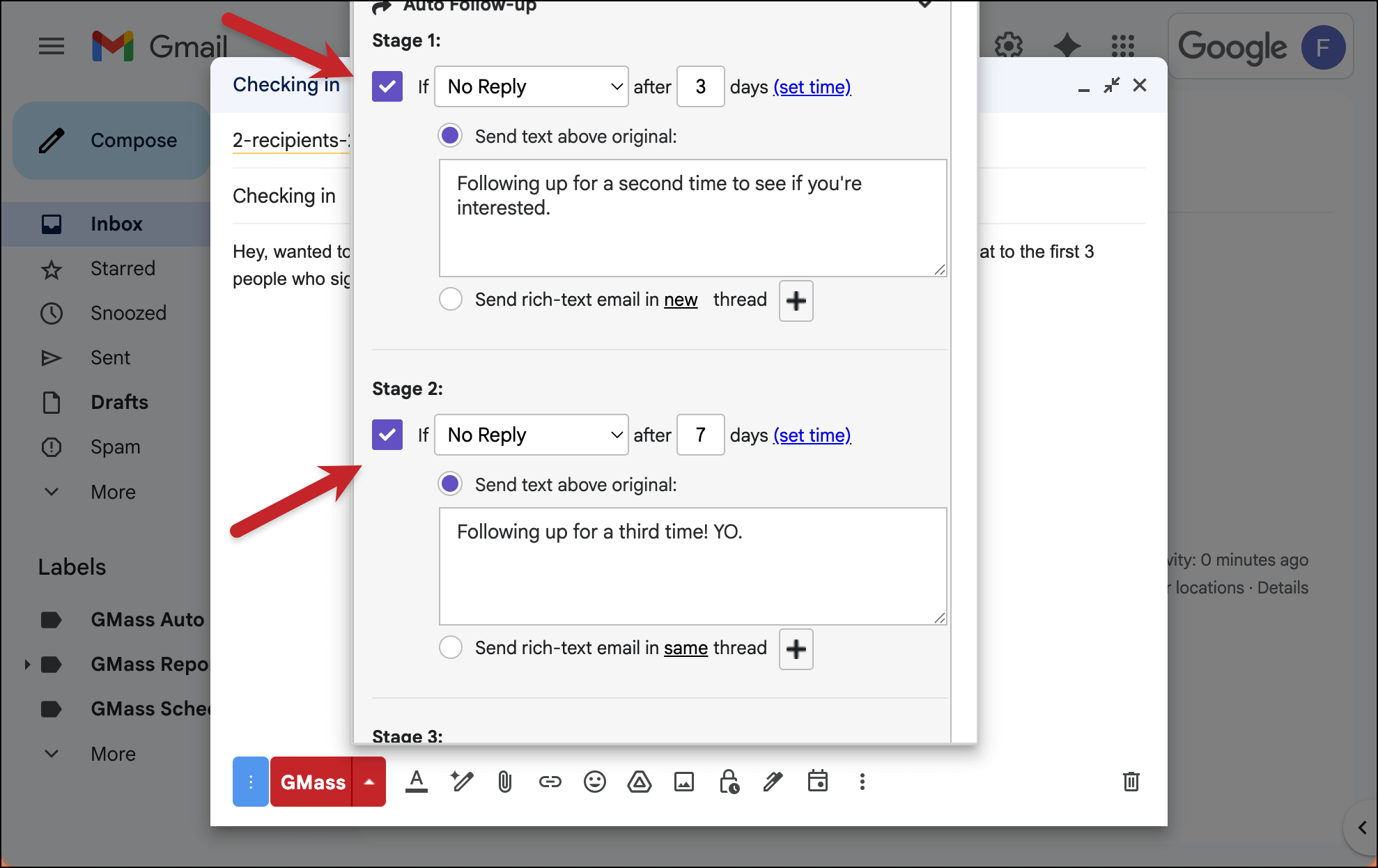 Open the GMass dashboard, go into Settings, and open the Auto Follow-ups section