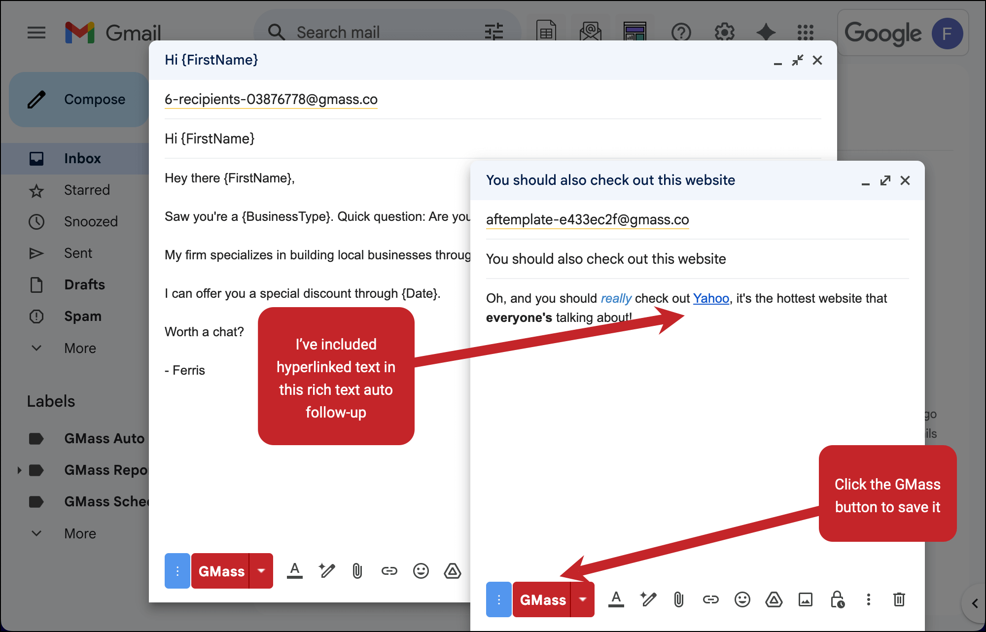 In order to send hyperlinked text in a follow-up (e.g., GMass), you’ll need to create an HTML email. We’ll use GMass’s rich-text auto follow-ups to do so.