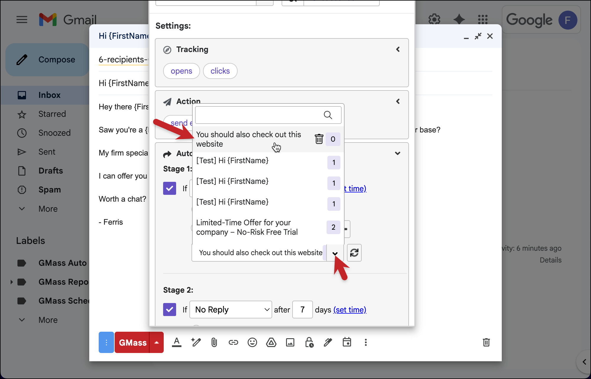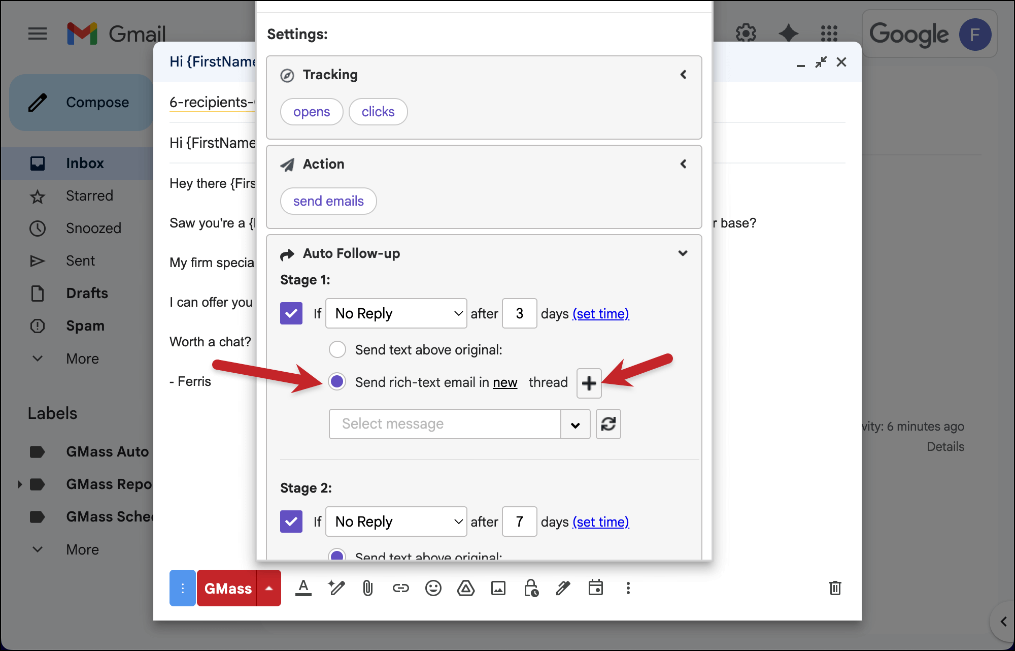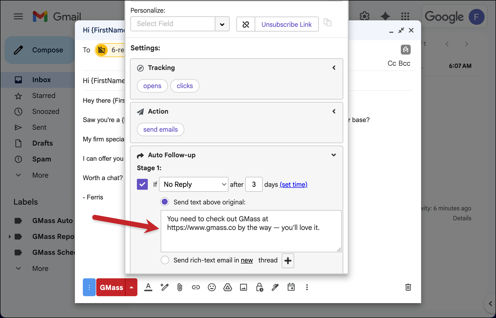 GMass’s plain text auto follow-ups are really easy to write — they’re right there in the settings box — which means a ton of people use them. That’s great!