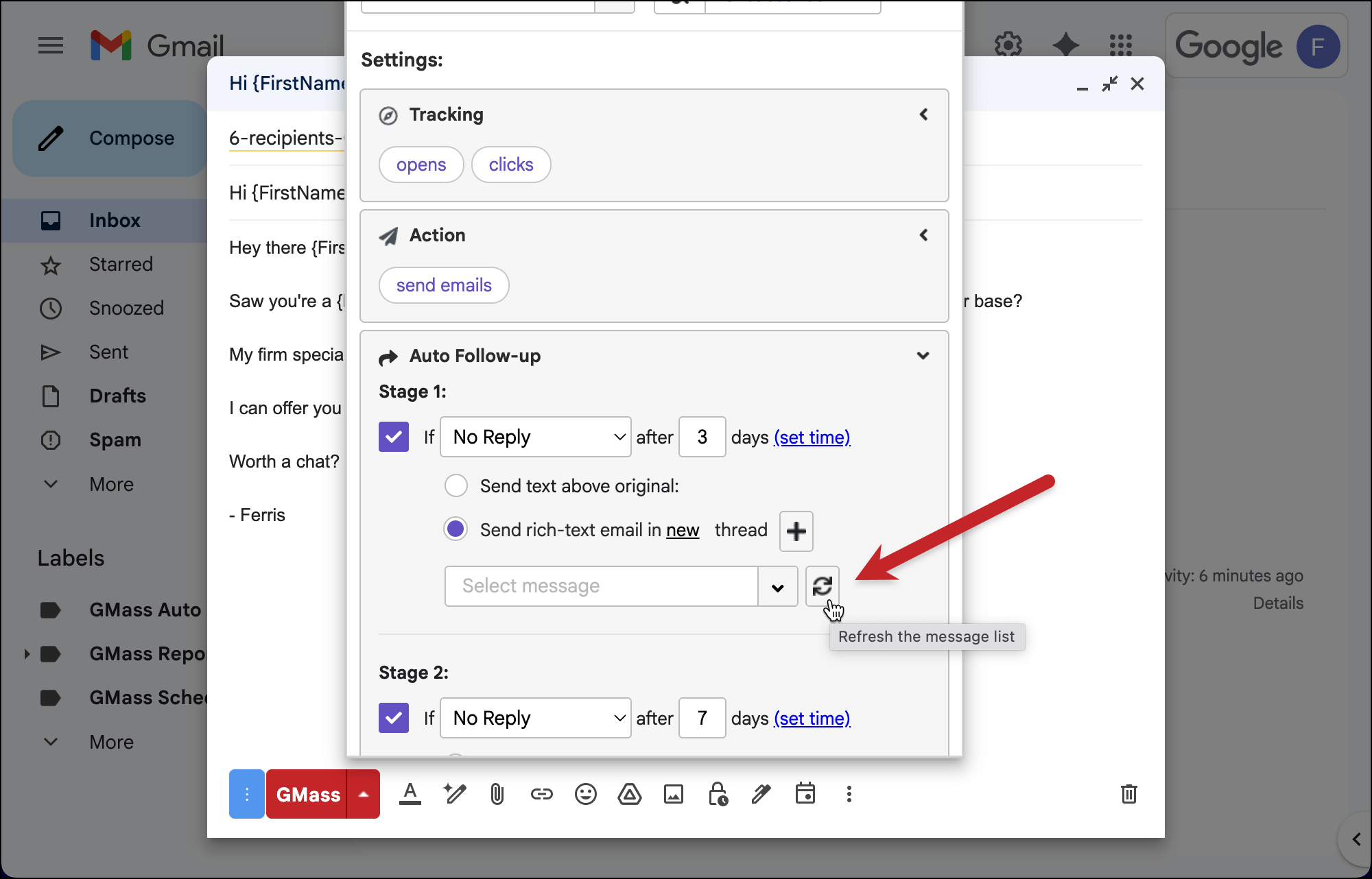 Once you’re done writing your auto follow-up, click the red GMass button to save it.