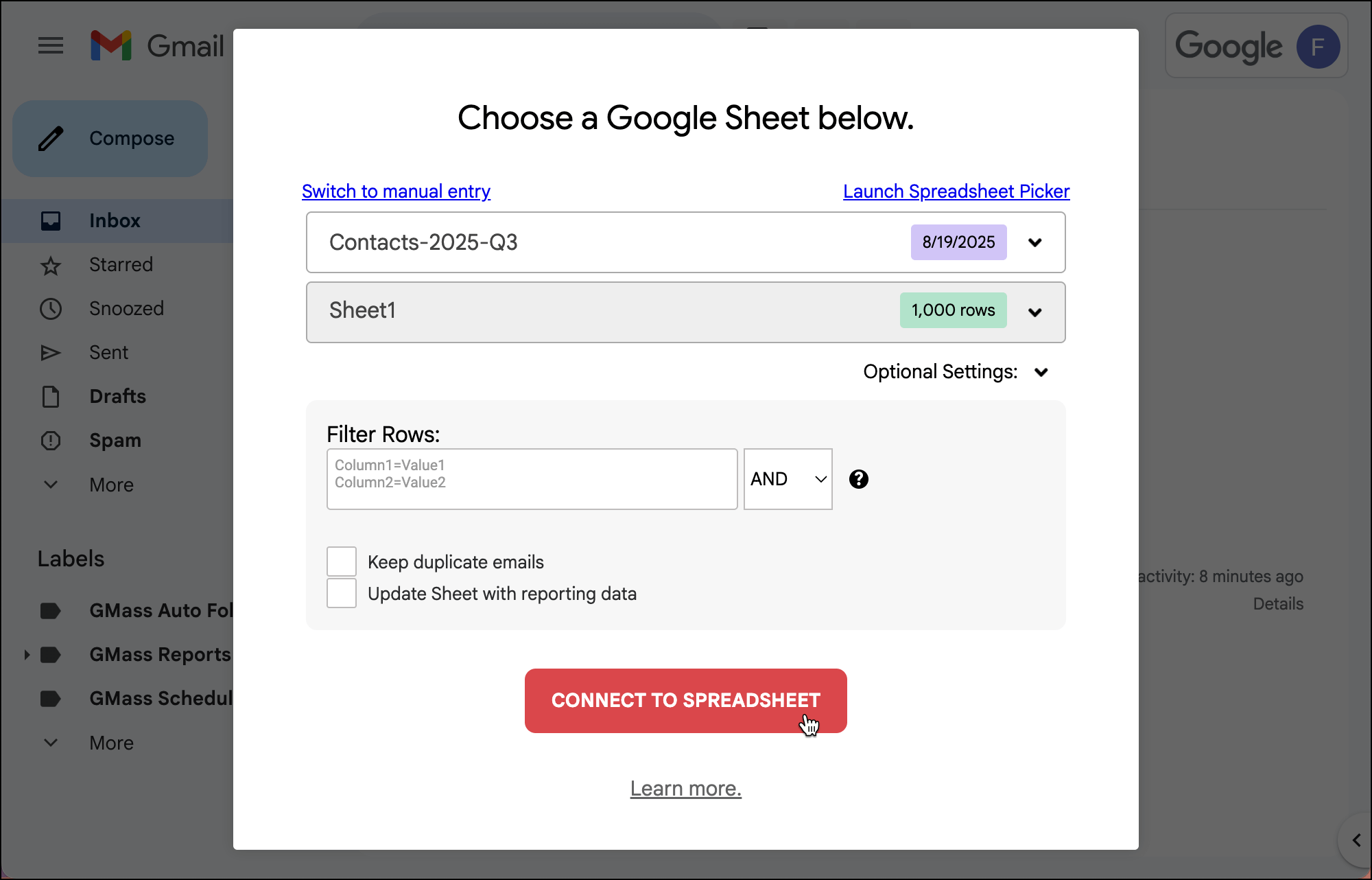 With GMass, you don’t upload a CSV of contacts to a campaign — you connect a Google Sheet. That distinction is important.