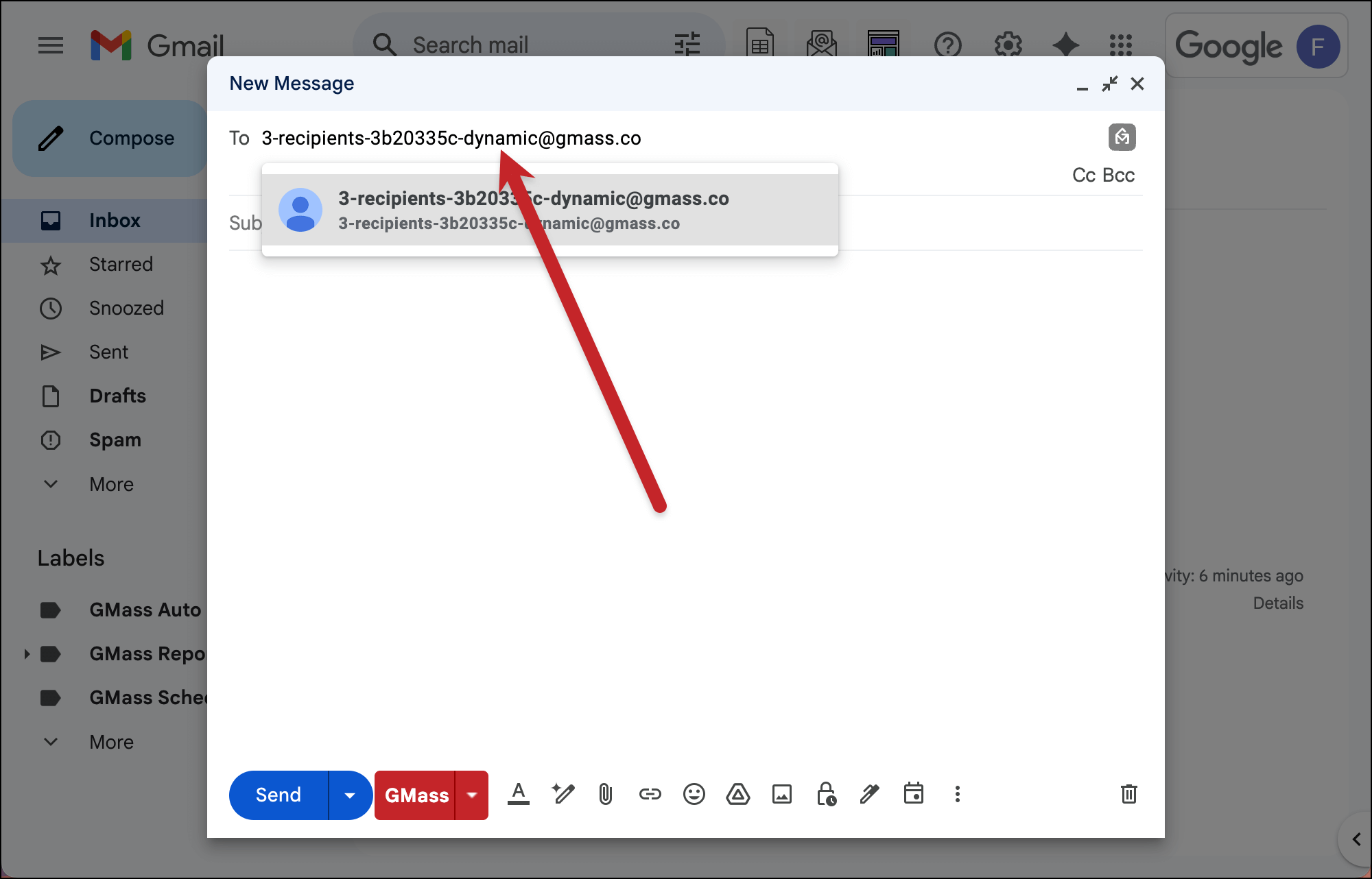 In the Compose window, edit the alias email address GMass created, by adding the word “dynamic” before the @ symbol.