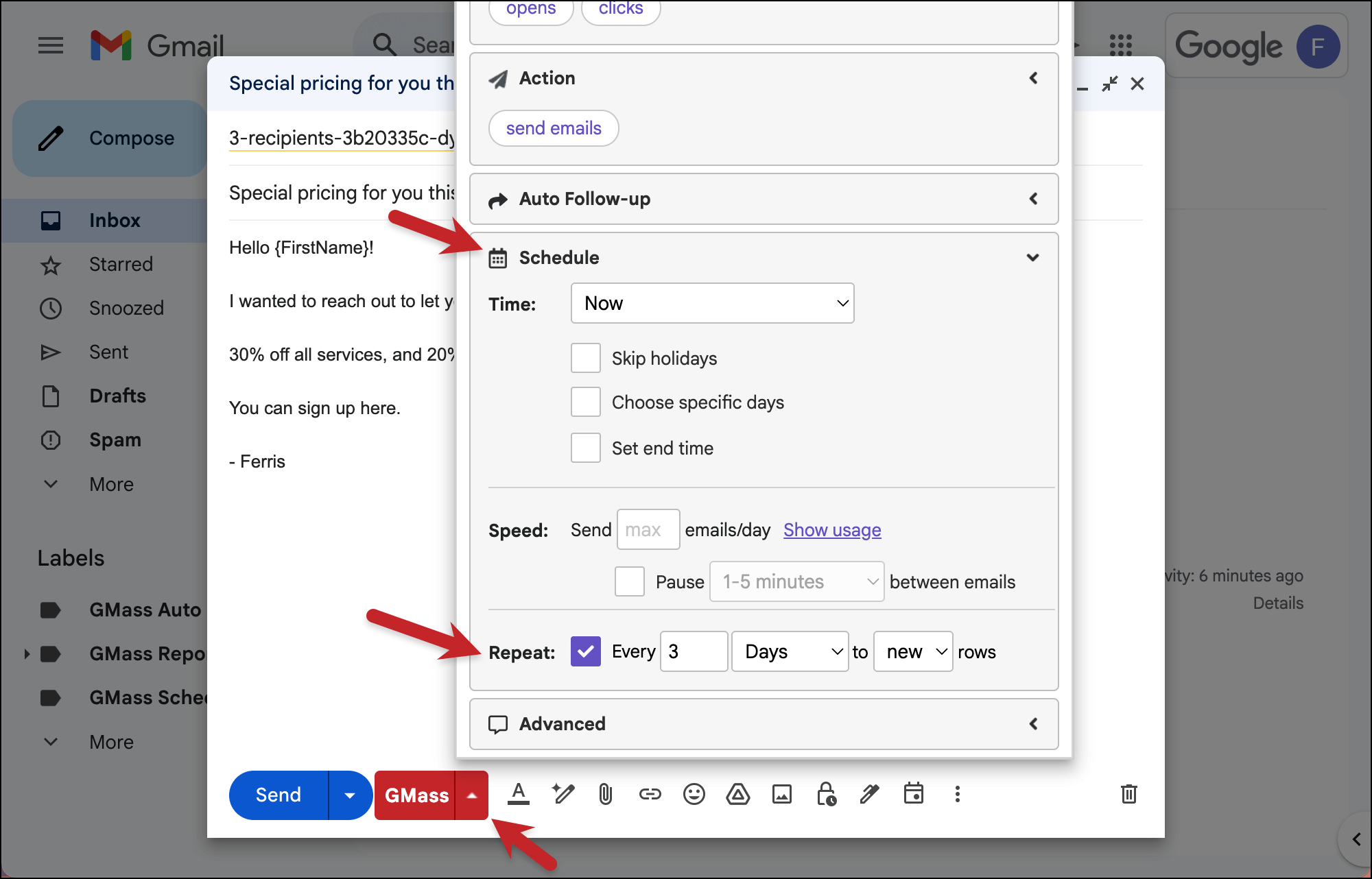 And thanks to the recurring campaign, GMass will regularly check your Sheet for new rows and send to those new contacts when they’re added.