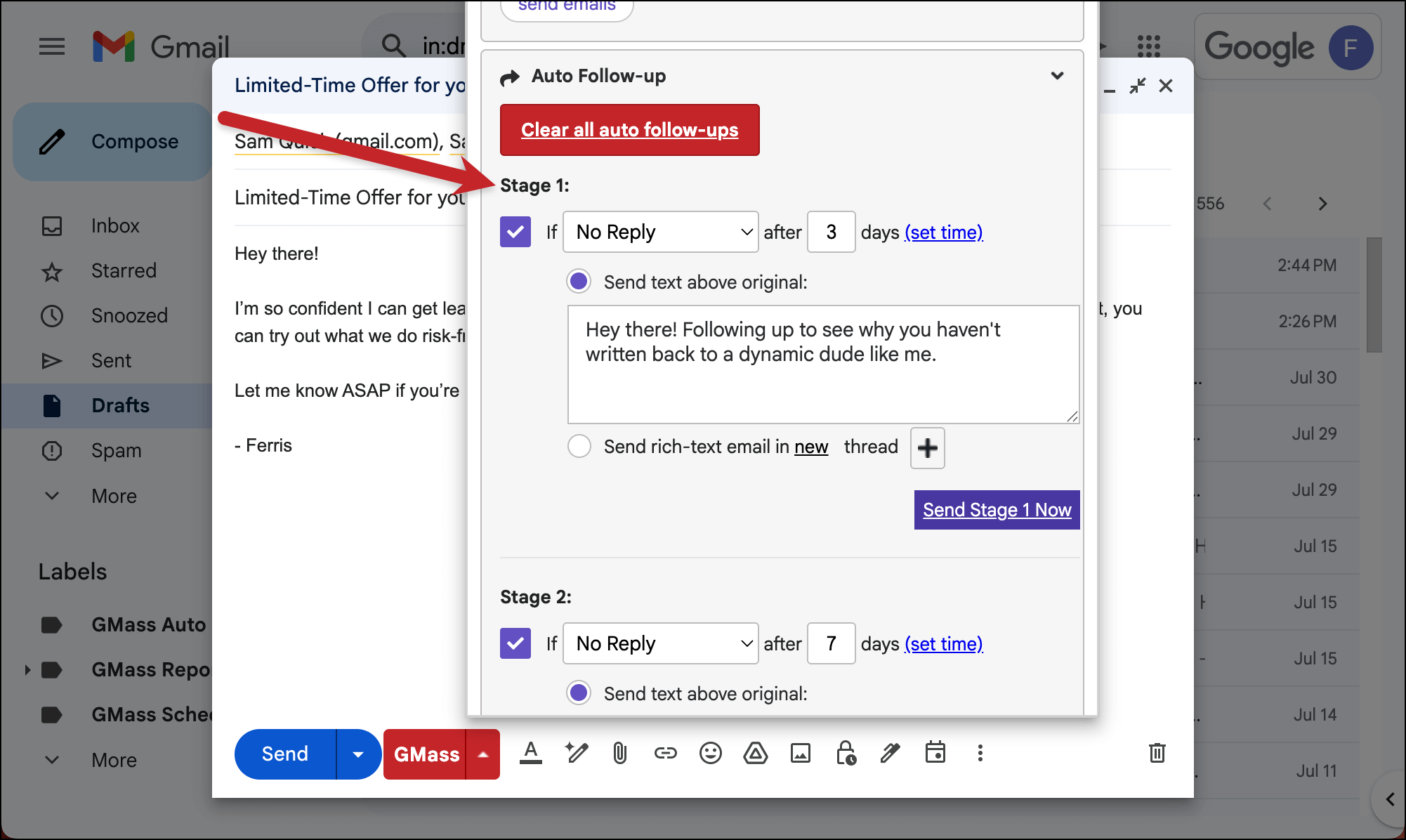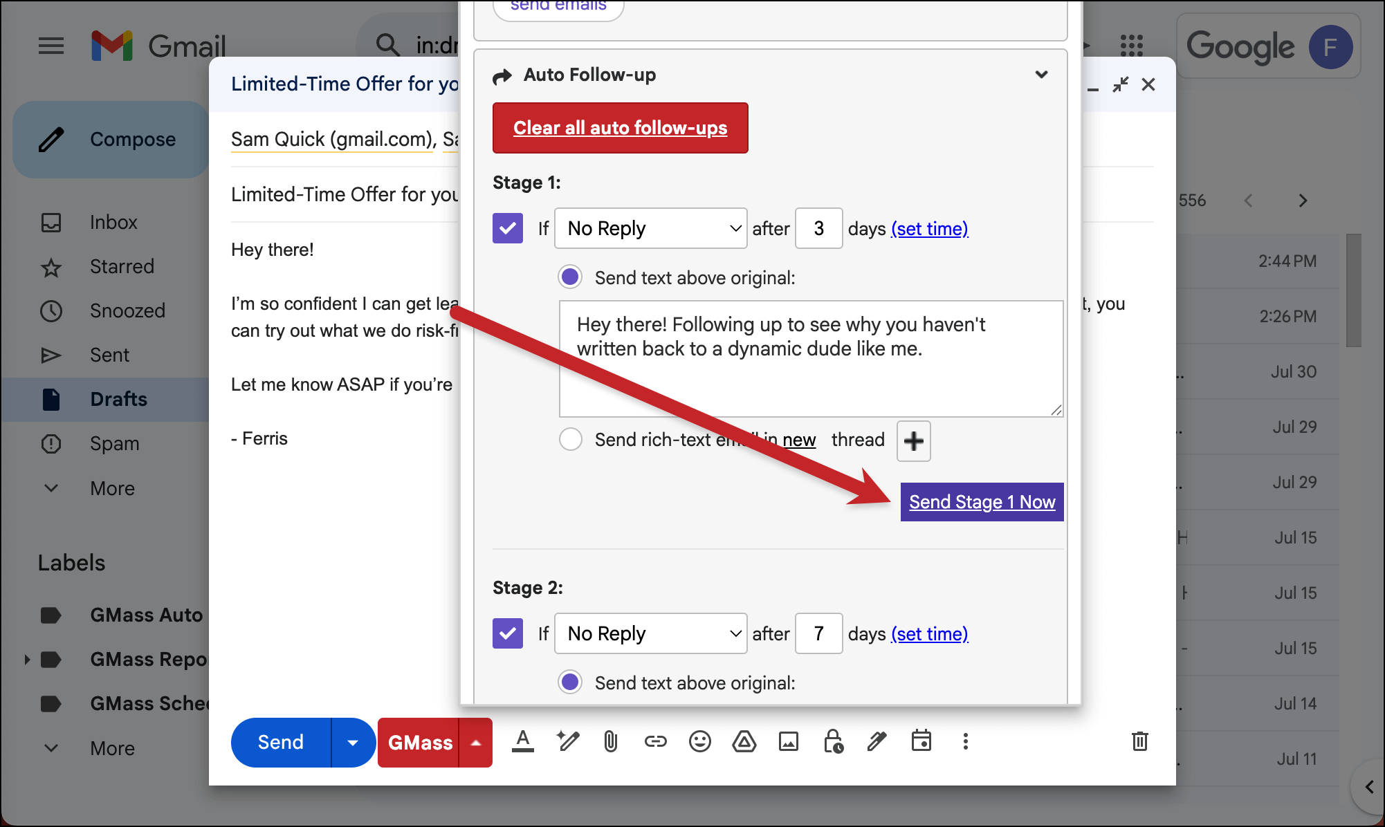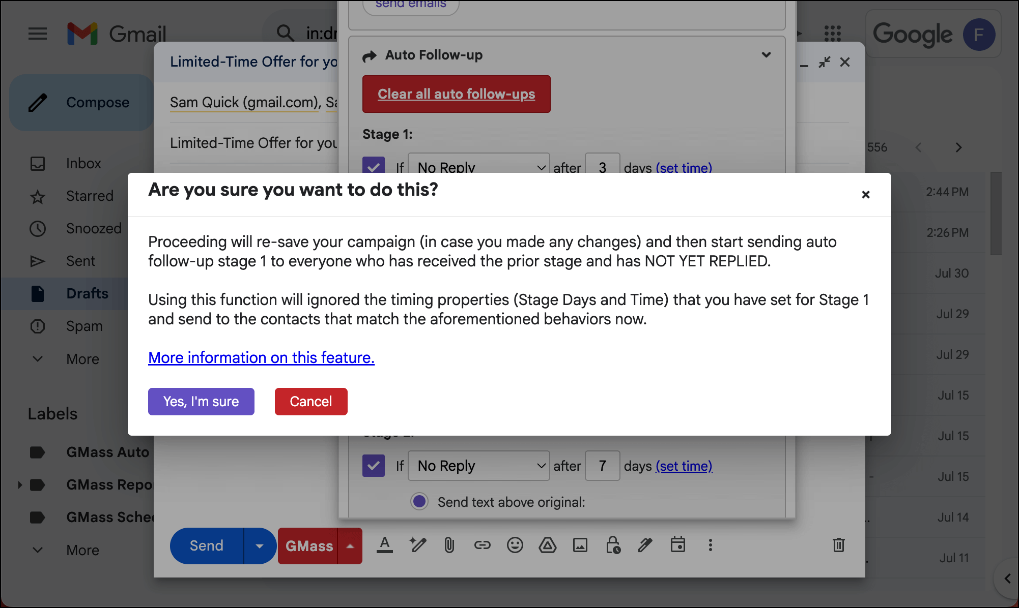 Sometimes an auto follow-up won’t go out exactly when you might have thought. Maybe you’ve hit your Gmail limits on sending day. Maybe you forgot you’ve skipped sending on certain days. Maybe Gmail had a technical hiccup at the scheduled send time.