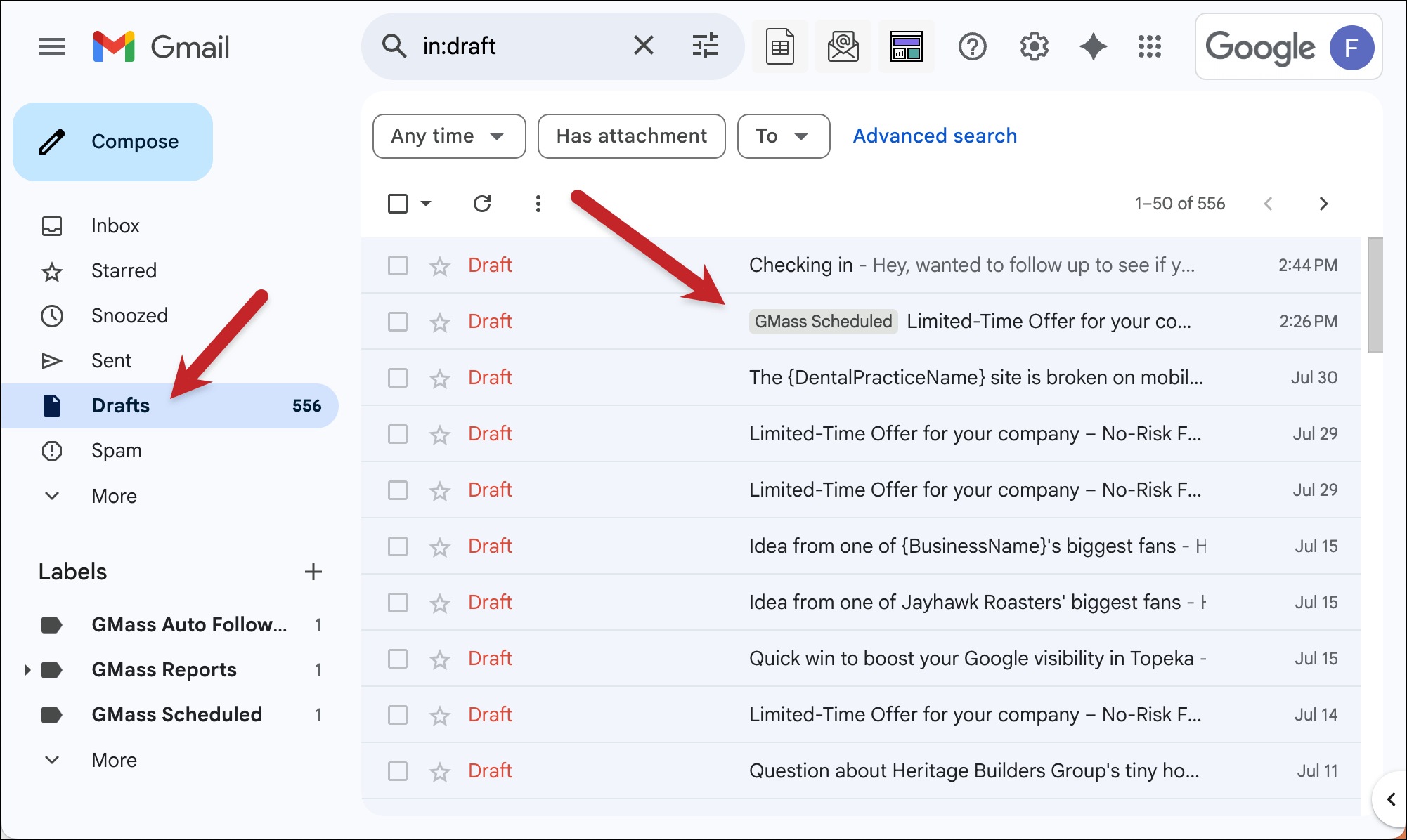 1. Head to Gmail, go to the Drafts folder, and find your campaign draft