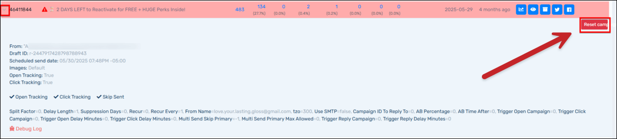 You’ll find it in the GMass dashboard. The campaign will be highlighted red and you’ll see a Reset campaign button when you expand the campaign info.