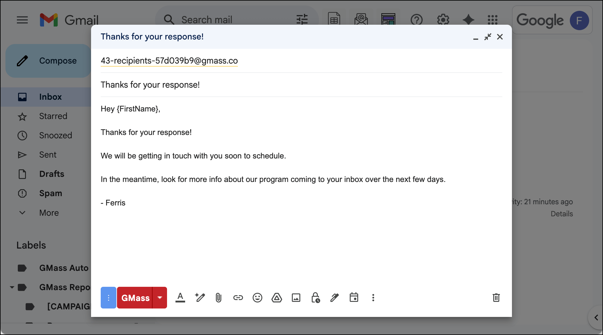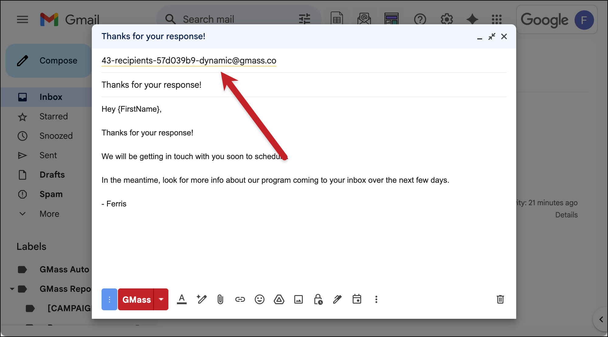 Add the word “-dynamic” right before the @ symbol. This turns your GMass campaign dynamic.