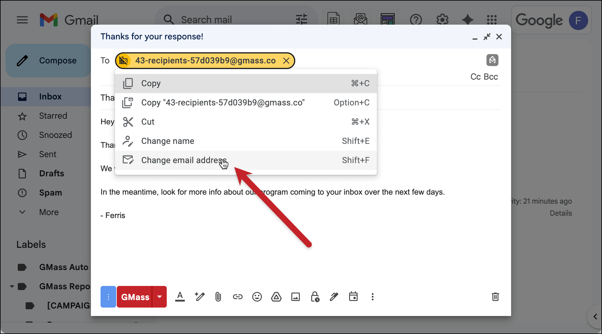 When the Gmail compose window pops up, right click on the email alias in the To field (something like 43-recipients-3241kjasd@gmass.co). Choose “Change email address” to edit the email address.