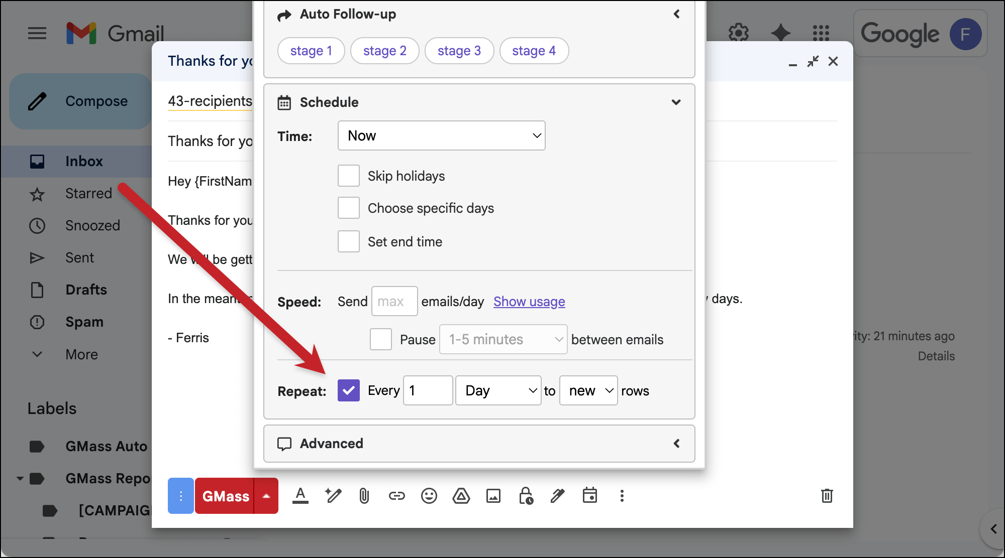 Then go to the GMass settings. In the Schedule section, set this up as a Recurring campaign at the frequency you want to send.
