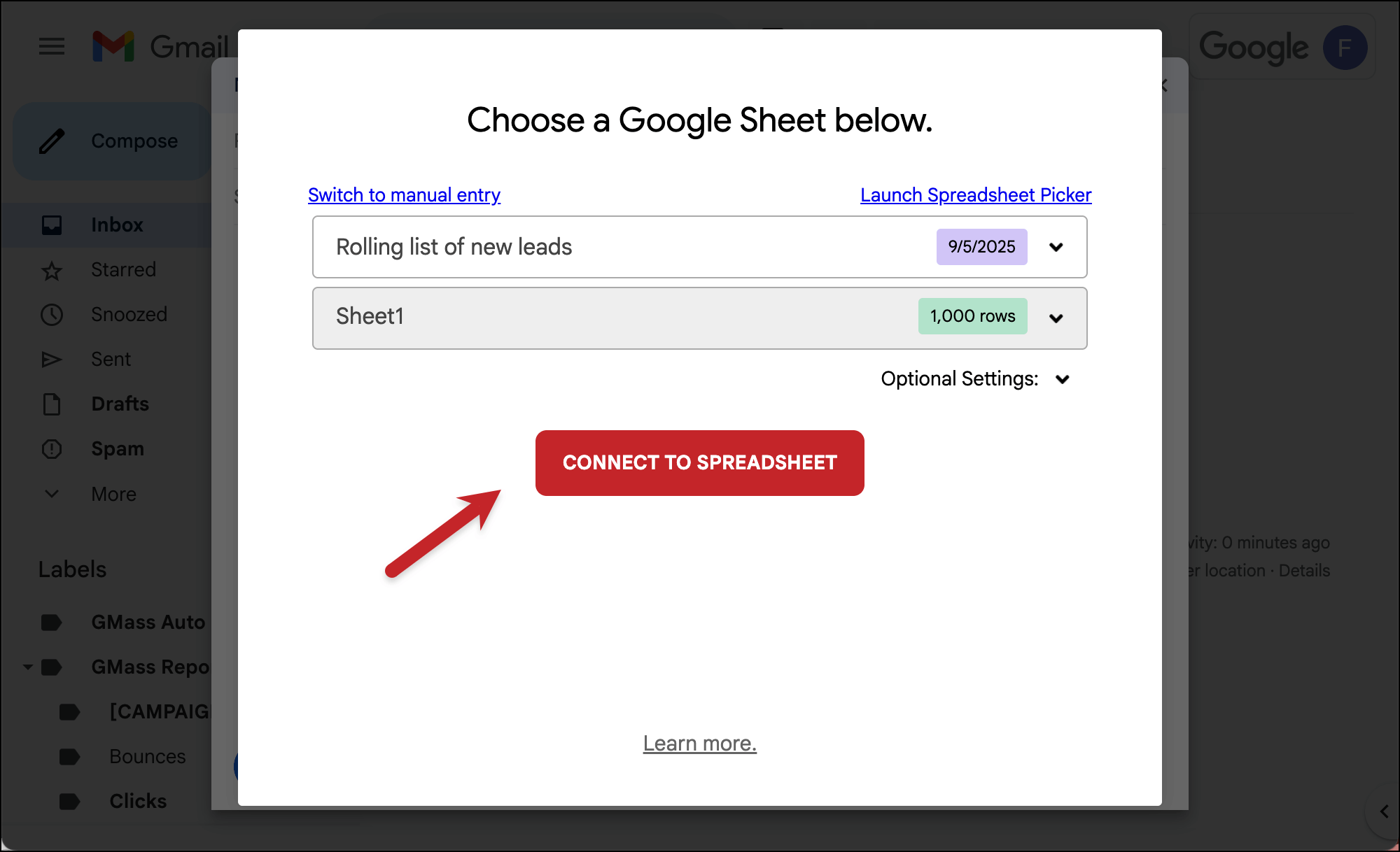 Open a new compose window, then click the GMass icon in the To field to connect your Google Sheet.