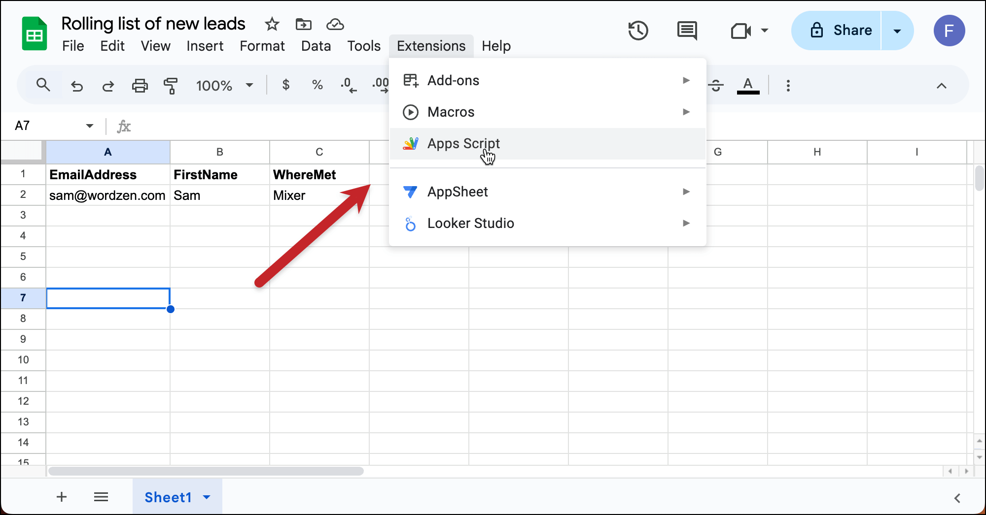Go back to your Google Sheet of responses and head to Extensions > Apps Script.