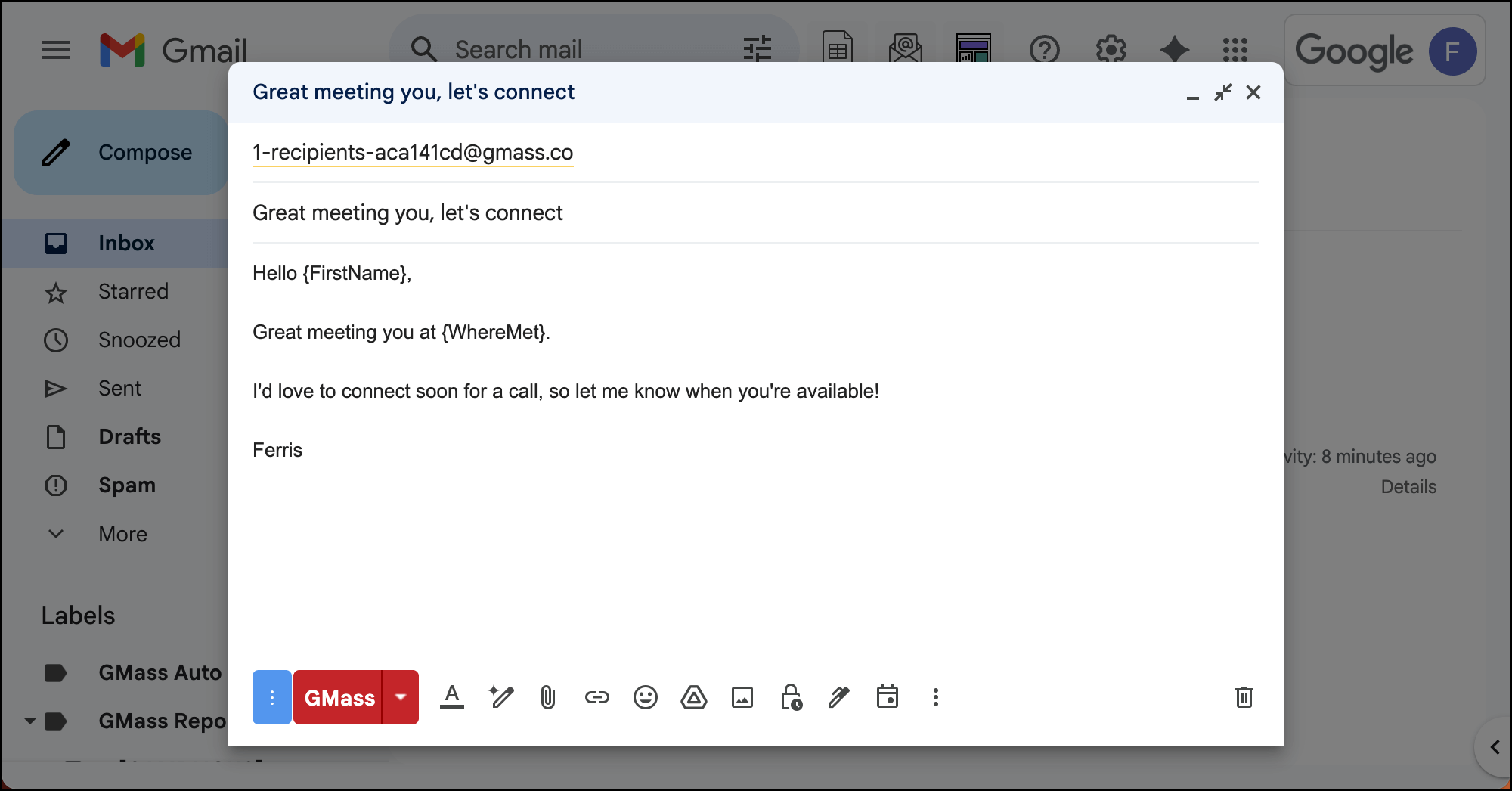 When everything is good to go, hit the red GMass button to launch your campaign to everyone initially on your Google Sheet. (In my example, my own email was the only contact on there.)