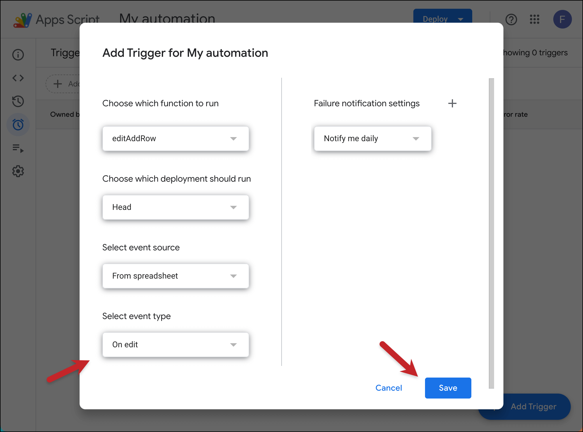 I chose “On edit” because I’m going to be manually entering in new contacts. If you’re automatically feeding them to a sheet, from a form on your website for instance, the email with the script instructions will tell you the alternative event type to choose.