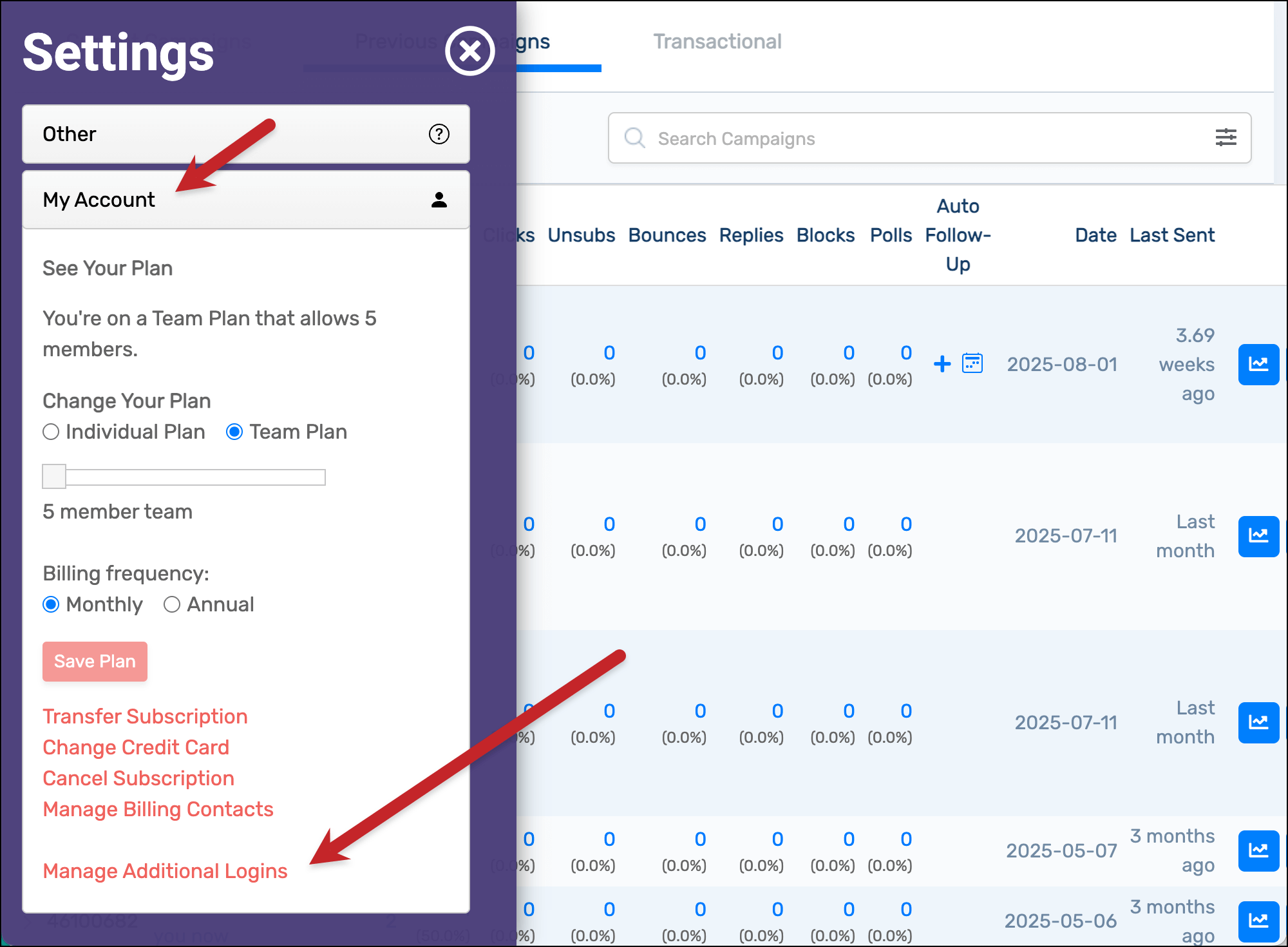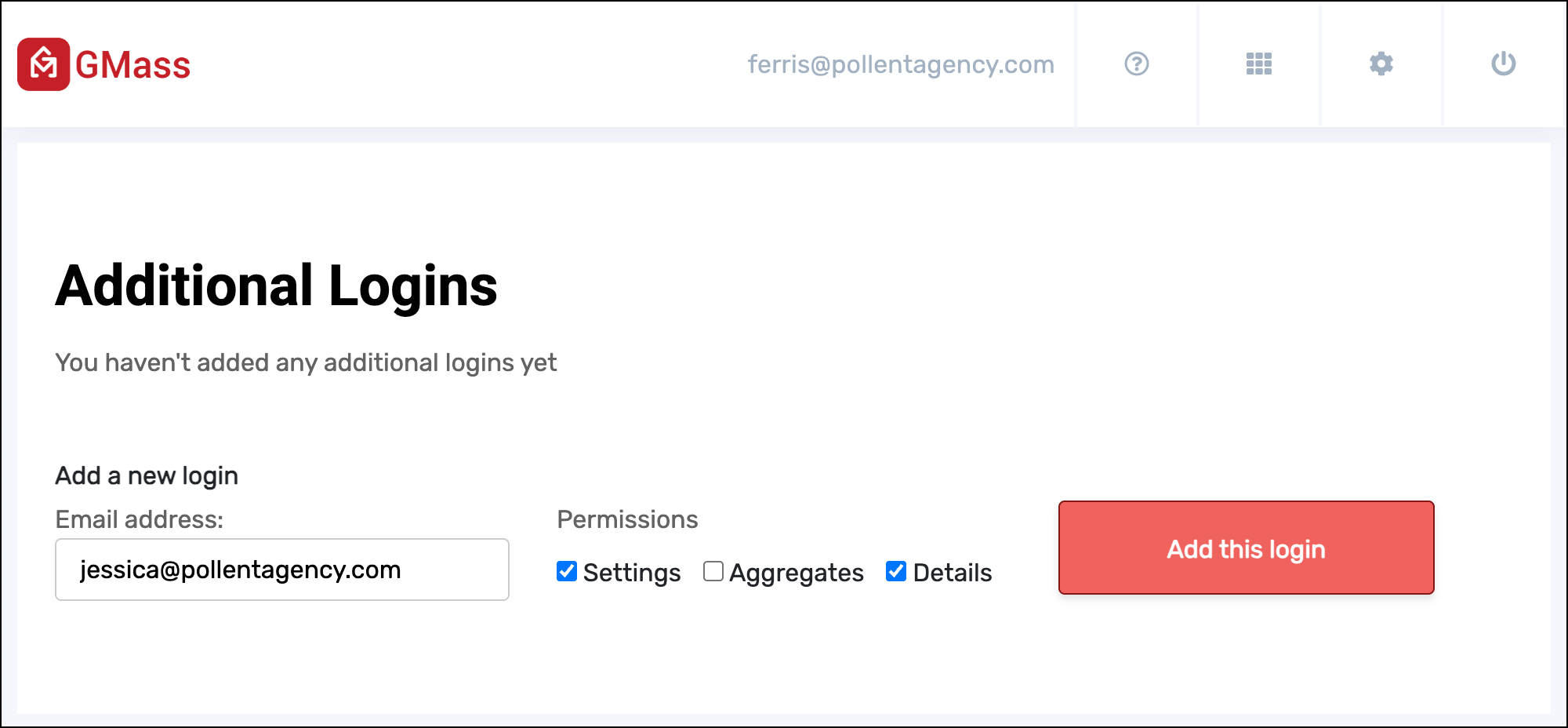In the GMass dashboard, open the settings. Scroll down to the My Account section. Then click on the link to Manage Additional Logins.