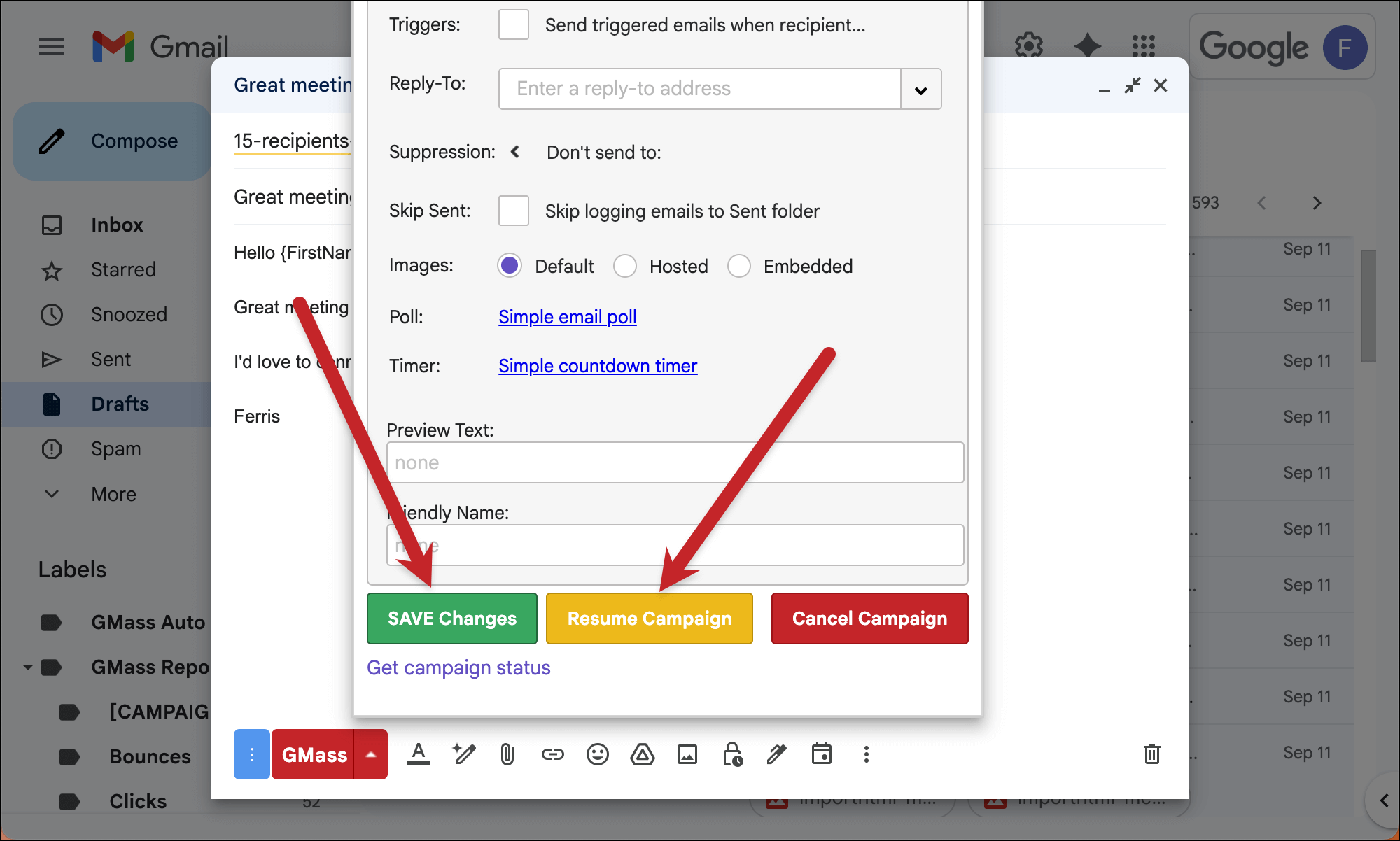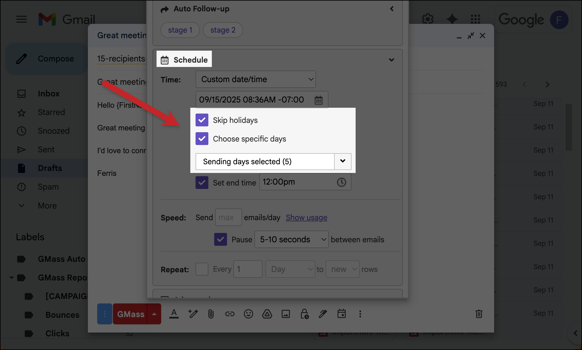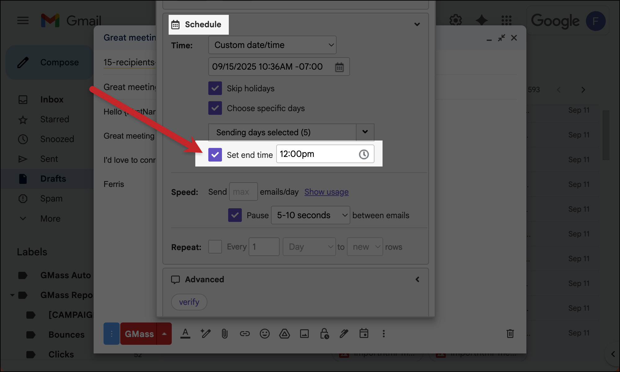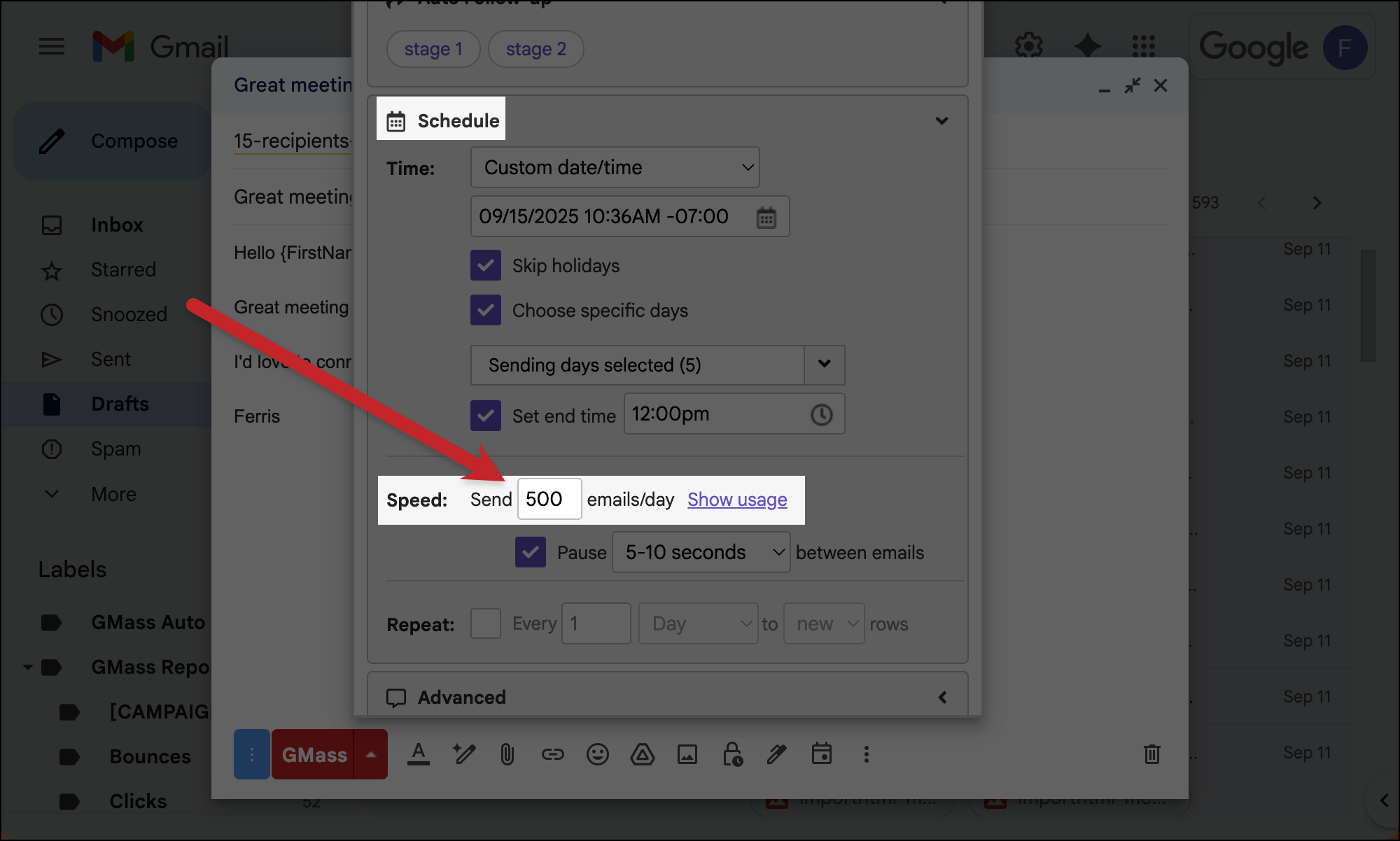 You might’ve put a limit on your number of daily emails, but for speed, we want to send max emails daily. (Don’t worry, GMass will stop once it hits Gmail’s limits. And later in this guide, we’ll talk about really speeding up your campaign by breaking those limits.)