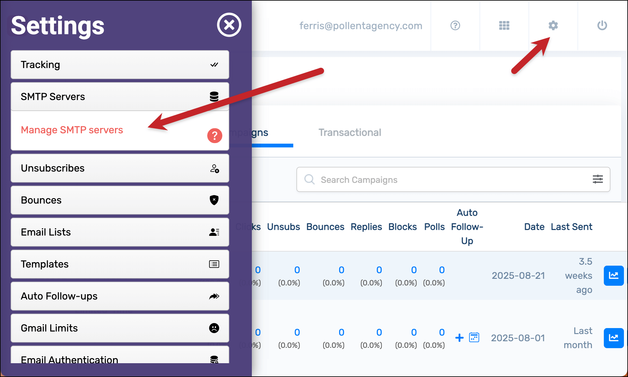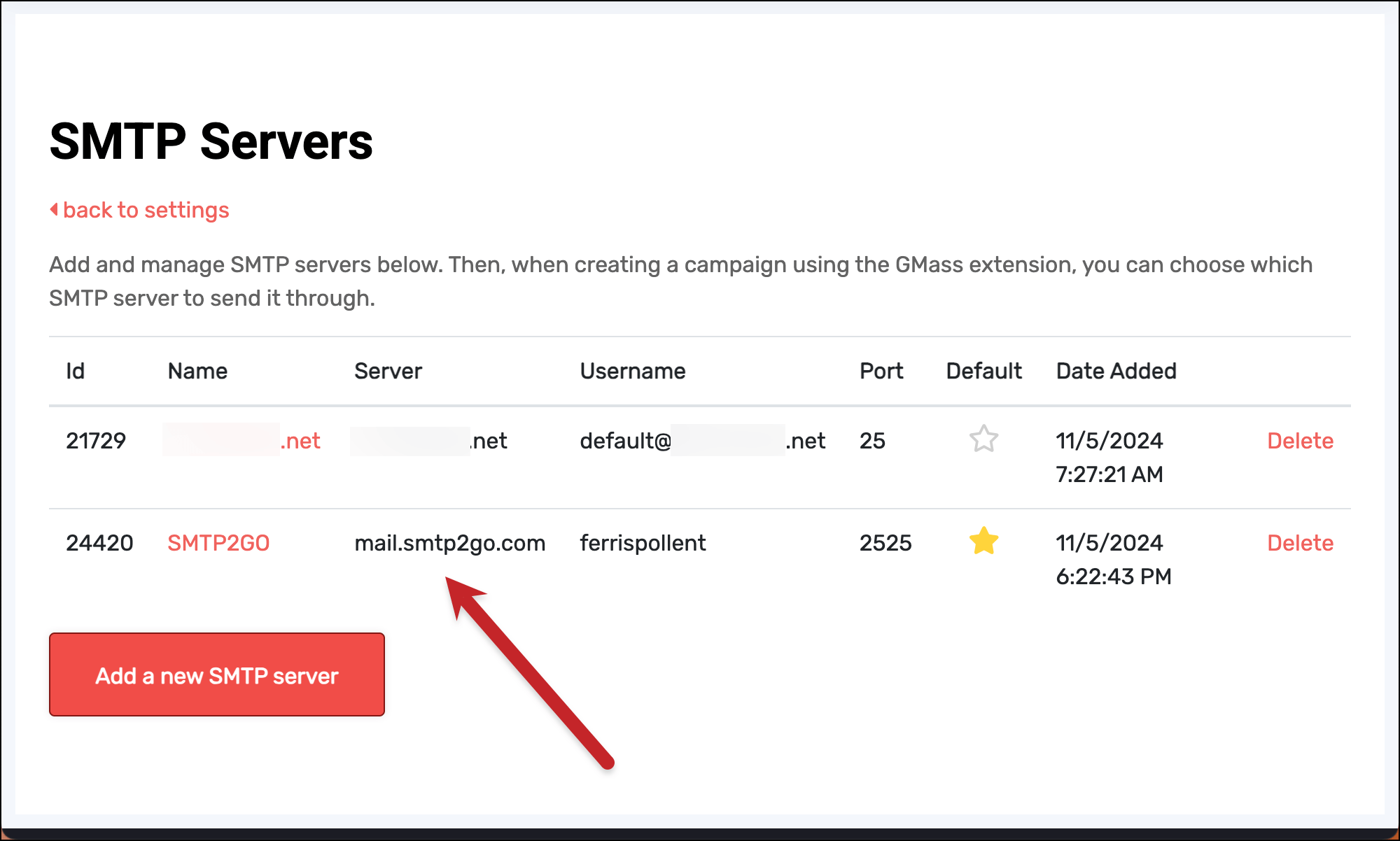 In the SMTP Servers section of the Settings, click Manage SMTP servers.