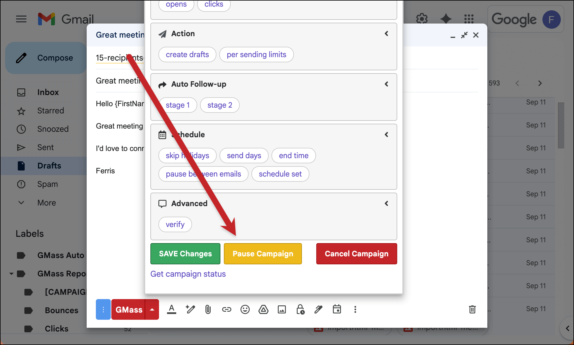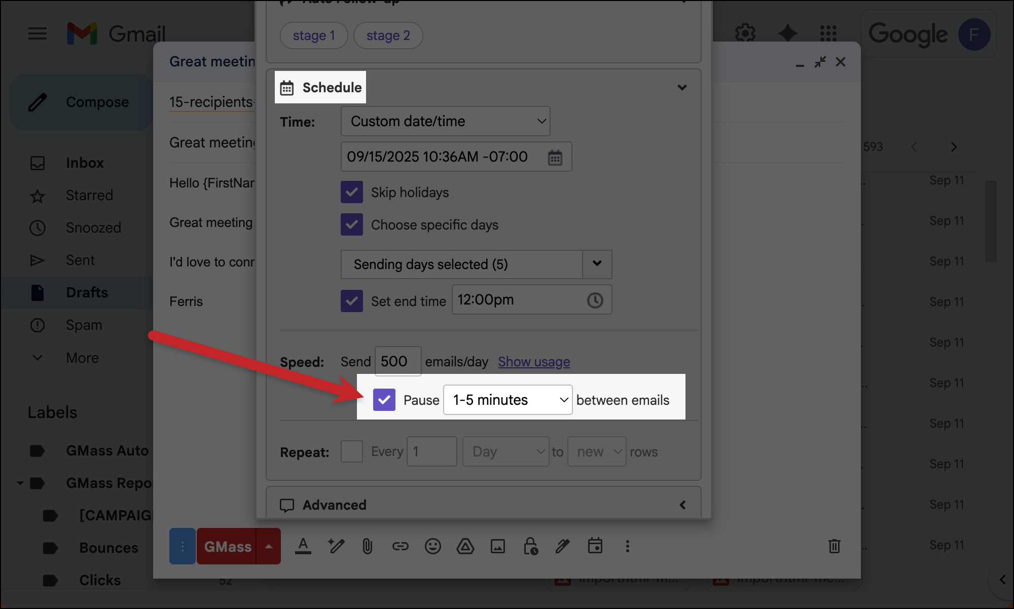 In the GMass settings box, go into the Schedule section. If you’ve added a pause in between your emails, you can either turn that off or switch to a shorter pause. (For instance, if you added a pause of 1-5 minutes, switch to 5-10 seconds for faster sending.)
