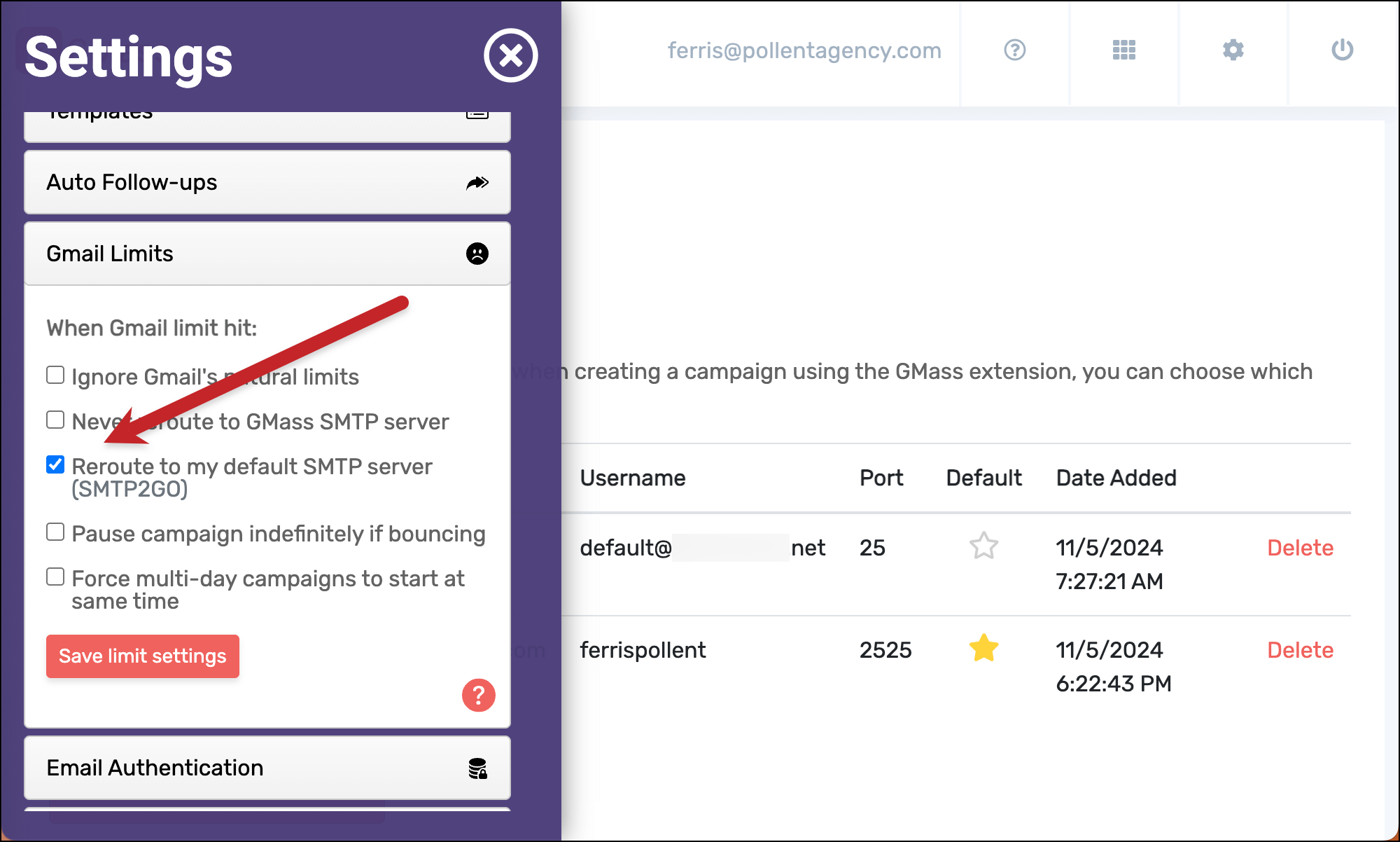 Now, back in the Settings options, go to the Gmail Limits section. And check the box to Reroute to my default SMTP server.