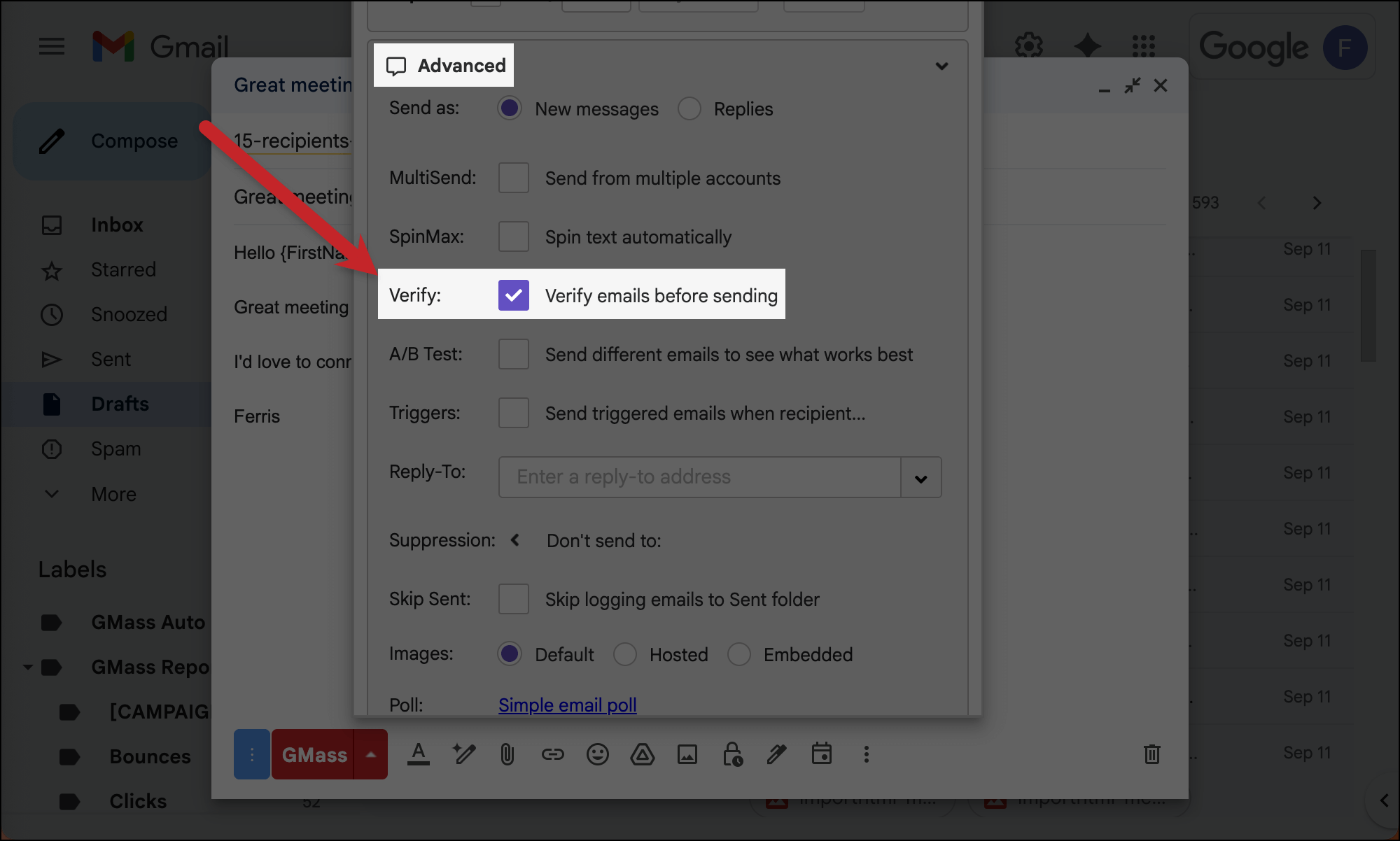 To turn off email verification, go into the Advanced section of the GMass settings and uncheck the box by Verify emails before sending.