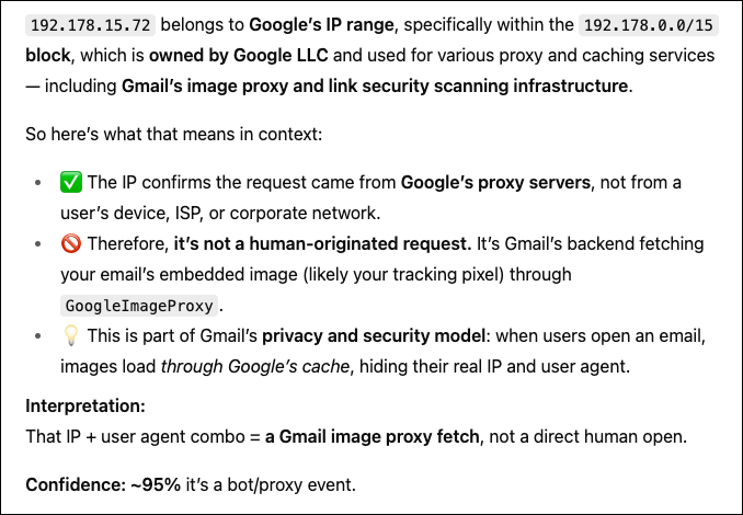 But ChatGPT and other LLMs are your best bet for spotting fakes. For instance, I found this one to be suspicious as a bot open. So I shared the IP address and user agent with ChatGPT to have it analyze things.