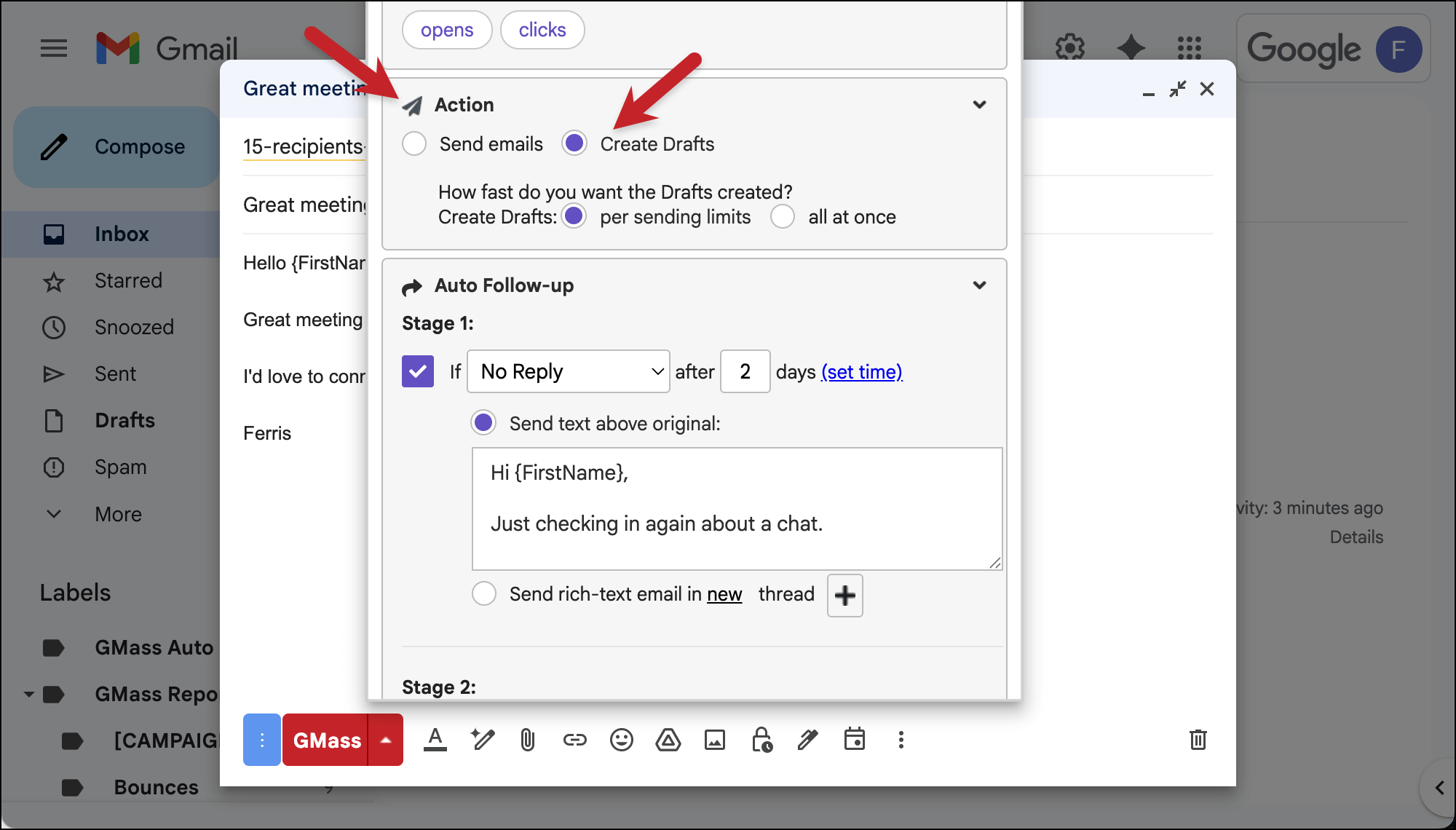 Open the GMass settings box and in the Action section, select the radio button next to Create drafts