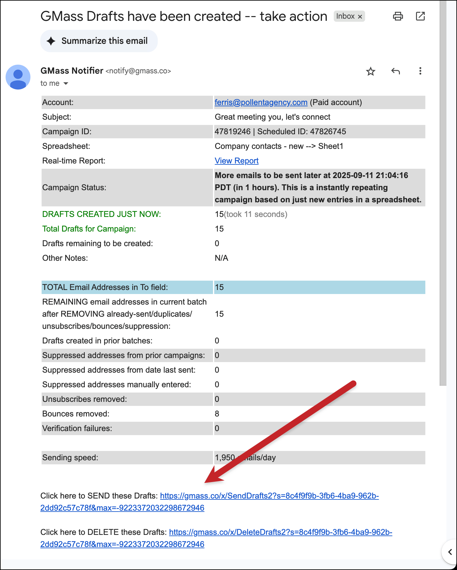 Assuming all is good, click the link at the bottom of GMass’s drafts email to send them. If there’s a problem with the mail merge, click the link to delete the drafts and fix the problem.