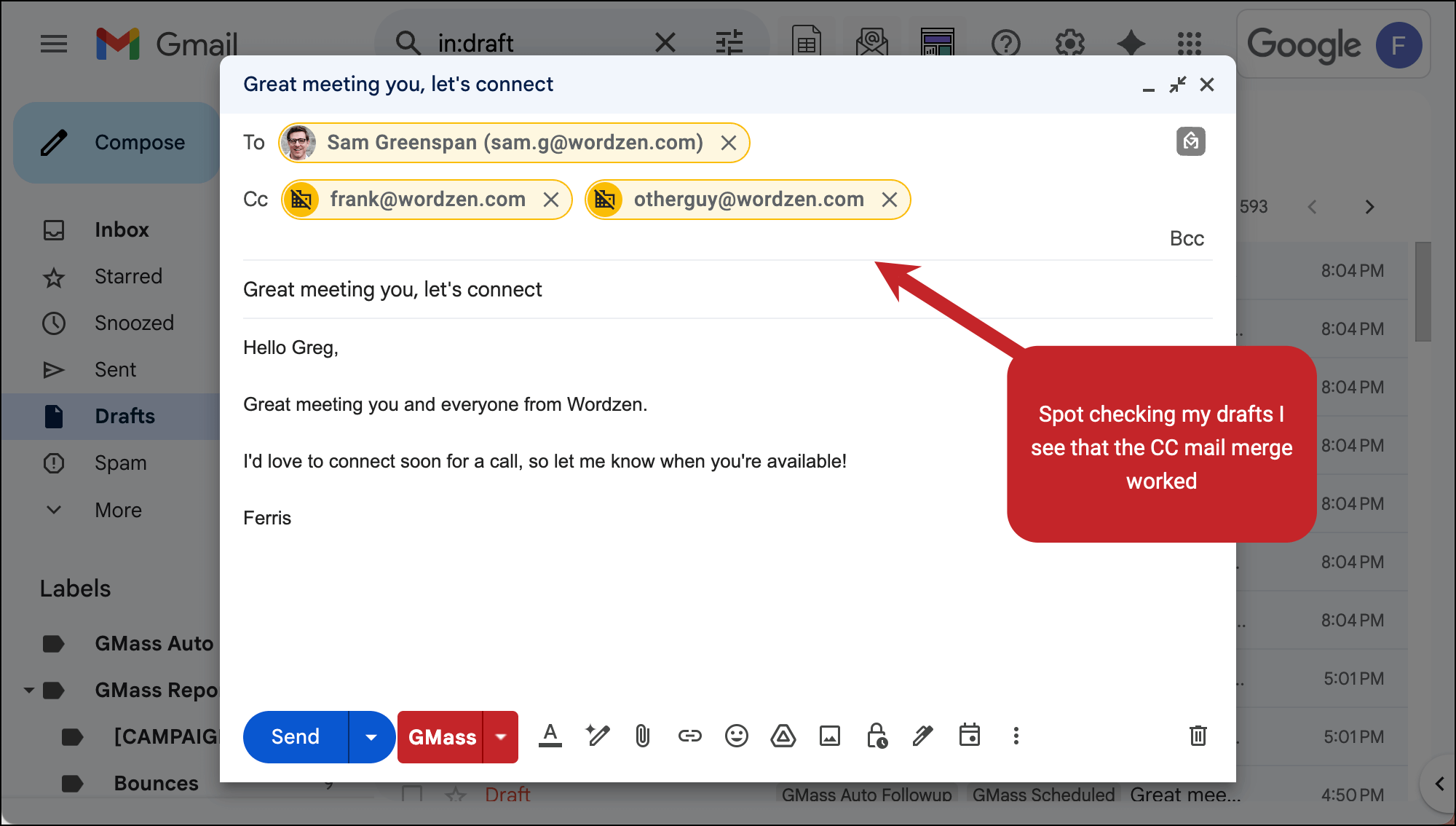 You can now go into the Gmail Drafts folder, where you’ll find all the drafts of these emails. Spot check a few to make sure the mail merge is correct.