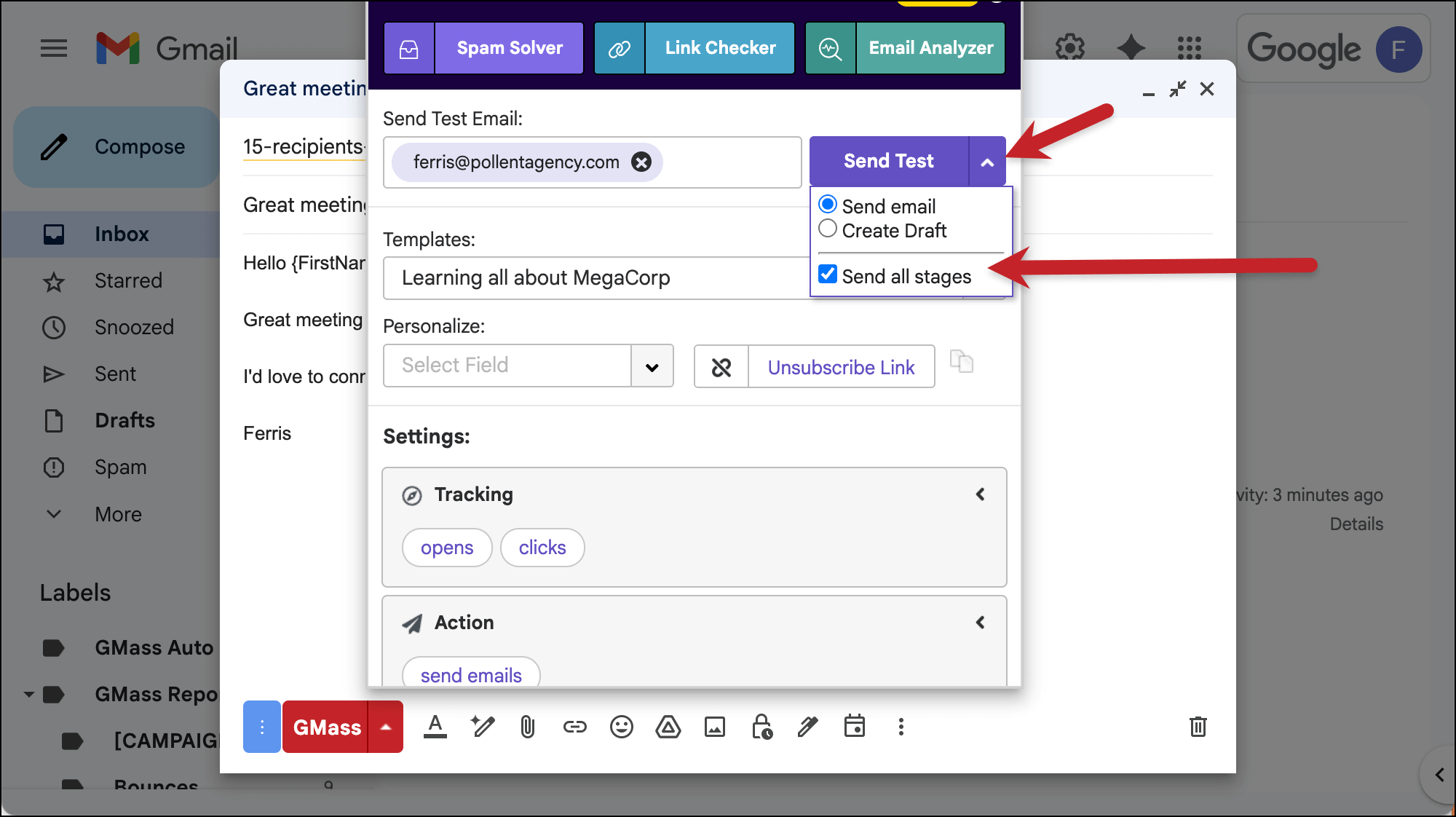 Go into the GMass settings, click the arrow next to Send Test in the top right, then check the box to Send all stages.