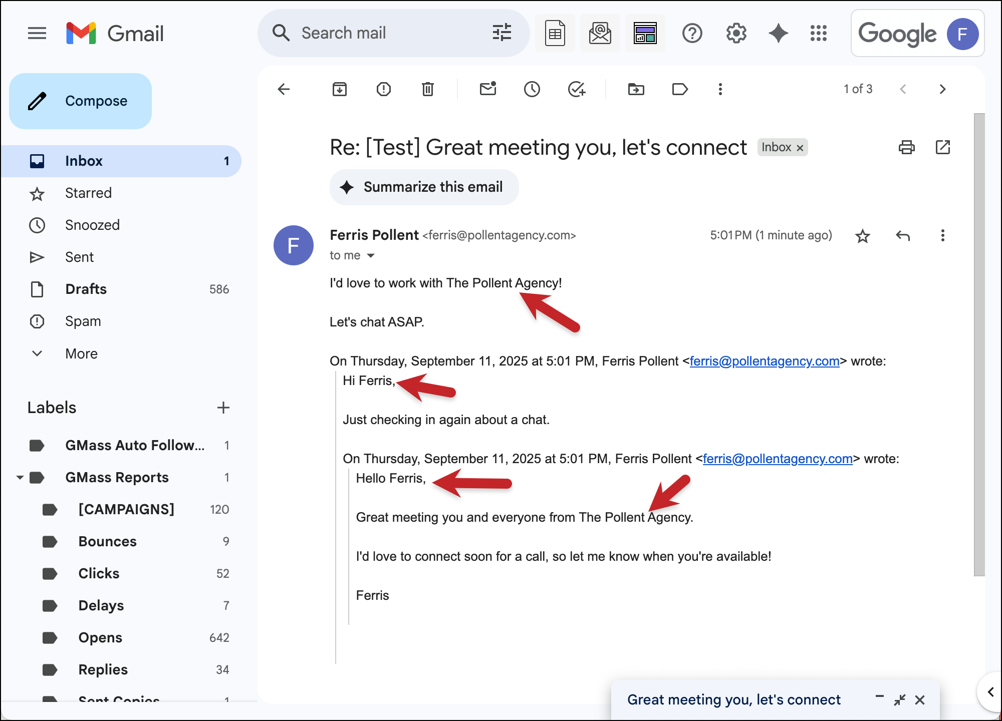 Soon (depending on the size of your campaign) you’ll receive an email from GMass telling you that your drafts have been created.