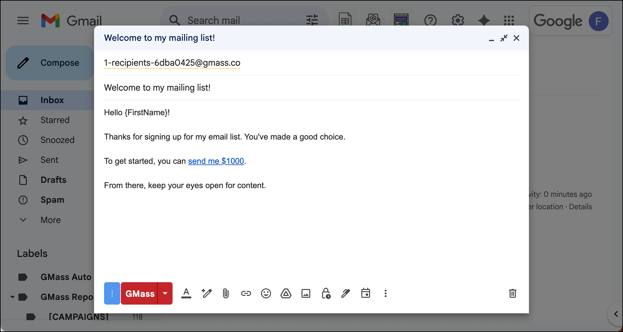 Once your welcome email is good to go, hit the red GMass button to get it started. Right now your email is the only address in the Google Sheet, so you’ll be the only recipient.