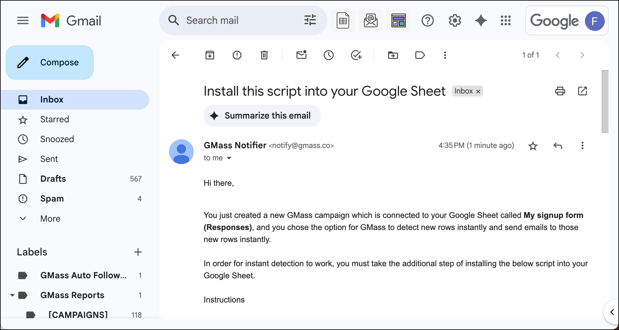 After you send the campaign, you’ll get a new email in your inbox from GMass Notifier with the title Install this script into your Google Sheet.