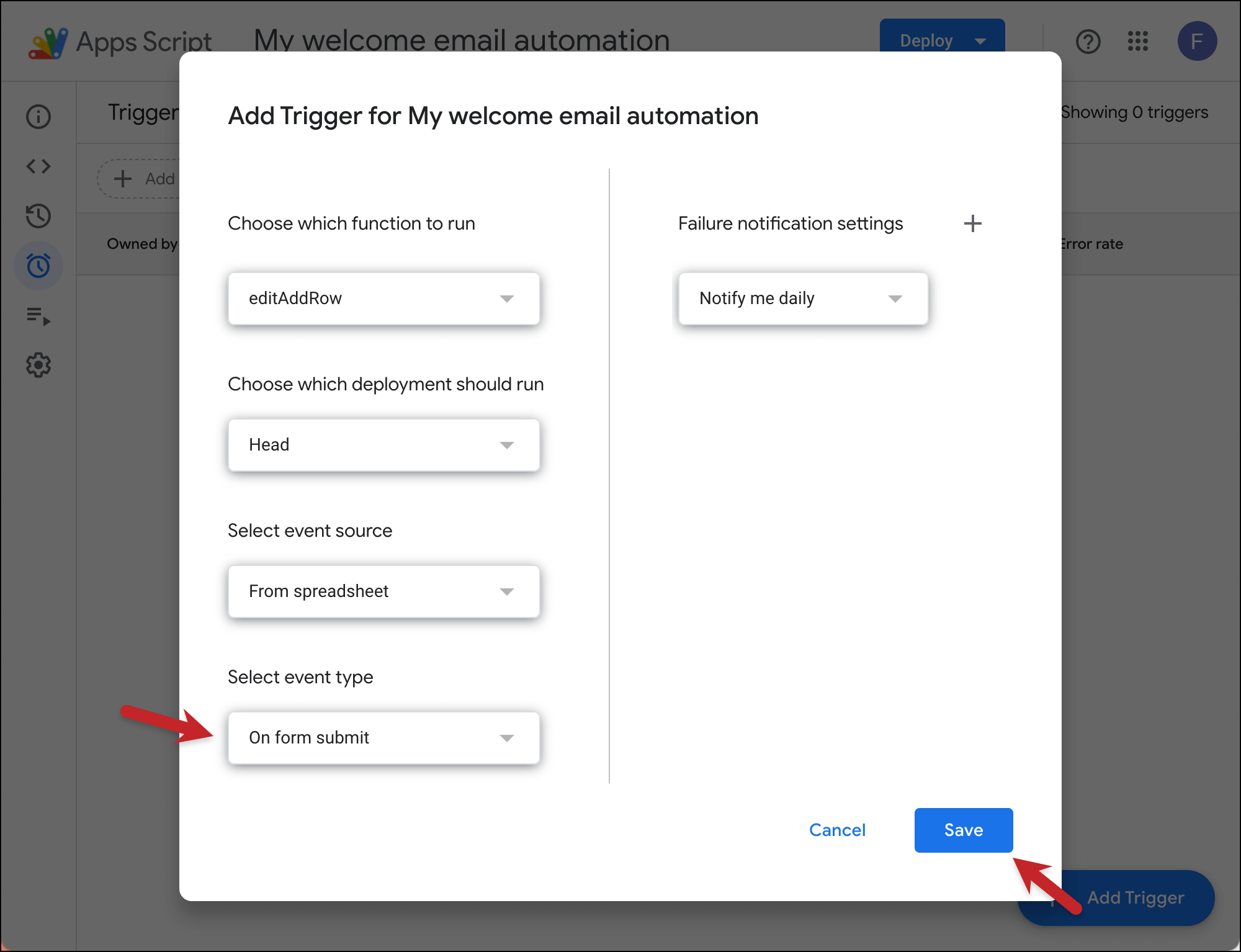 Follow the instructions from the email. You want the menus to be editAddRow, Head, From spreadsheet, On form submit, and Notify me daily. Then click Save.